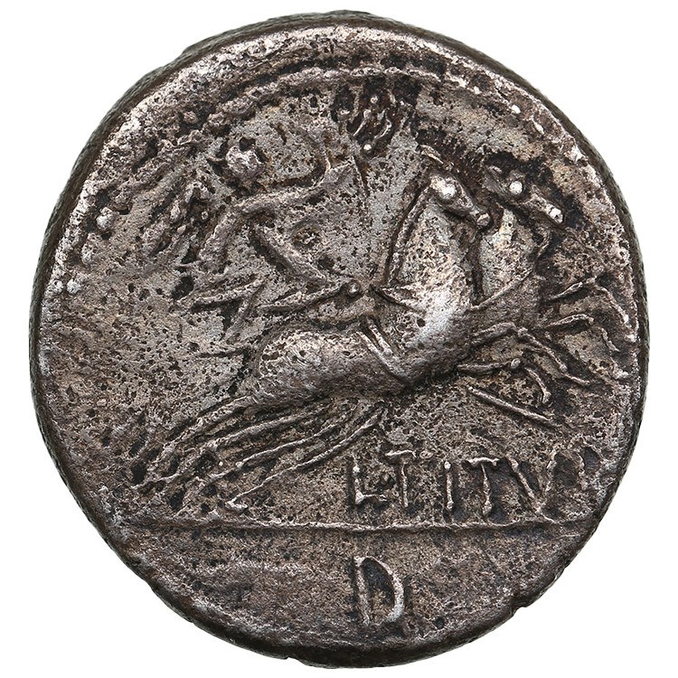 Rev.: Victory in biga right, bearing wreath; “L•TITVRI” below, control-mark D in exergue.