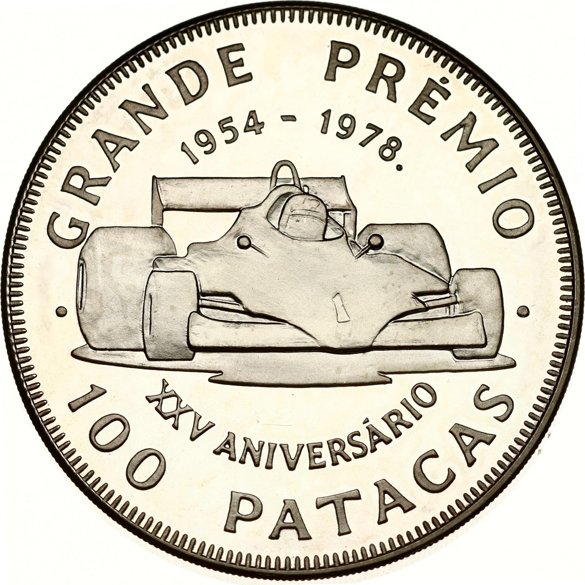 China, Macau. 100 Patacas 1978, Grand Prix Anniversary-No logos. 25th Anniversary of Grand Prix. Silver .925, 28.30 g. Mintage 5 500 pcs.KM 11. Small scratches.
