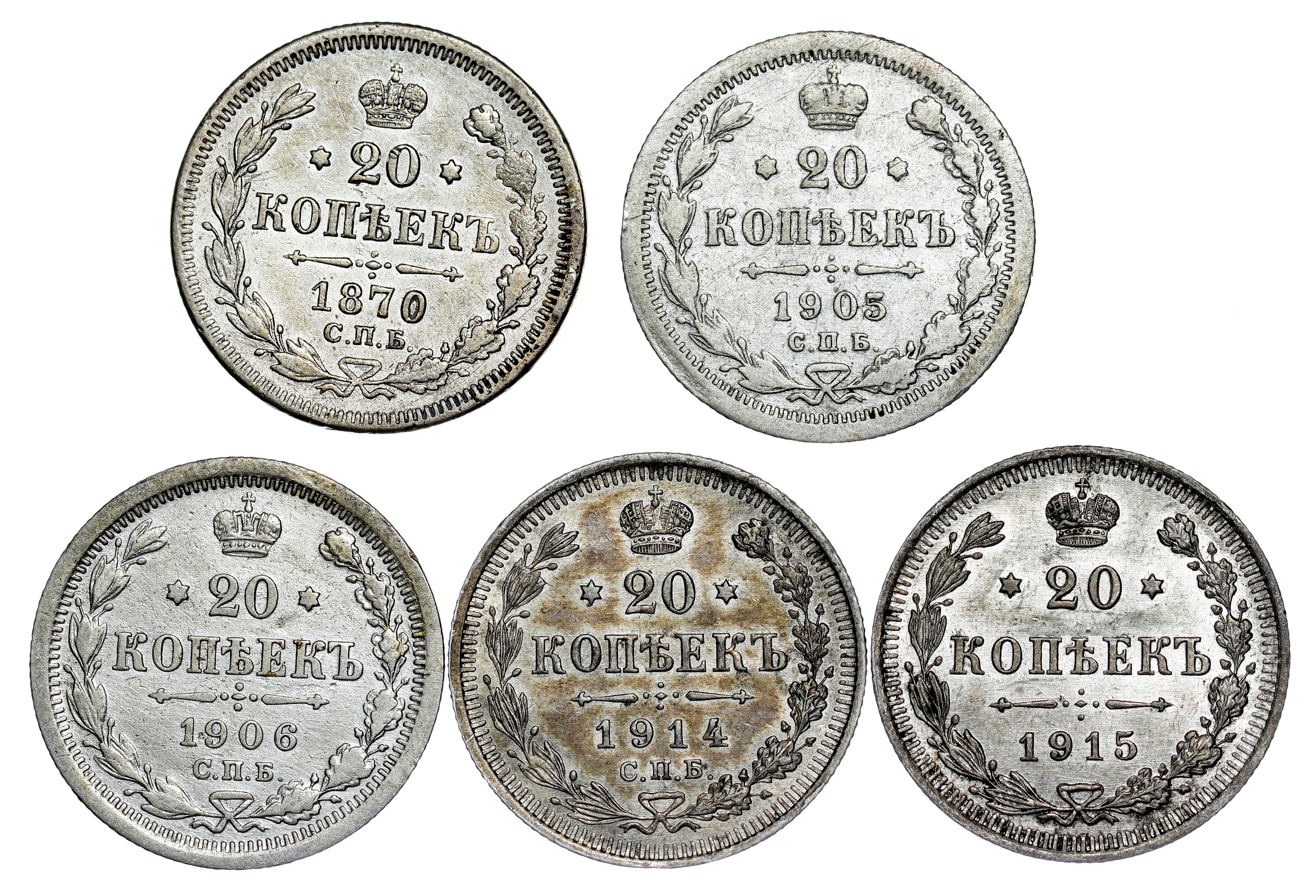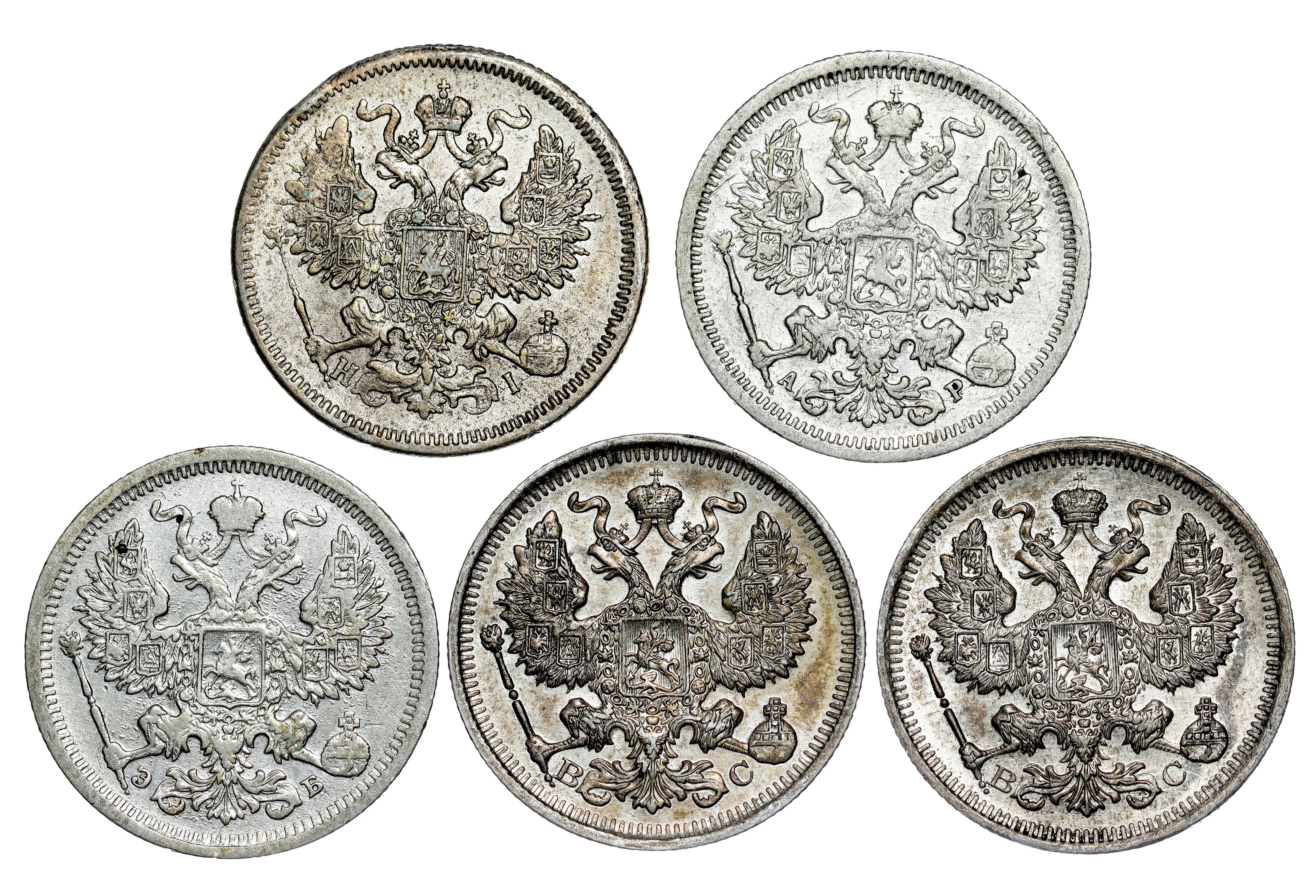 Russland - Alexander II (1855-1881) & Nikolaus II., 1894-1917. 20 Kopeken LOT – 5 pcs