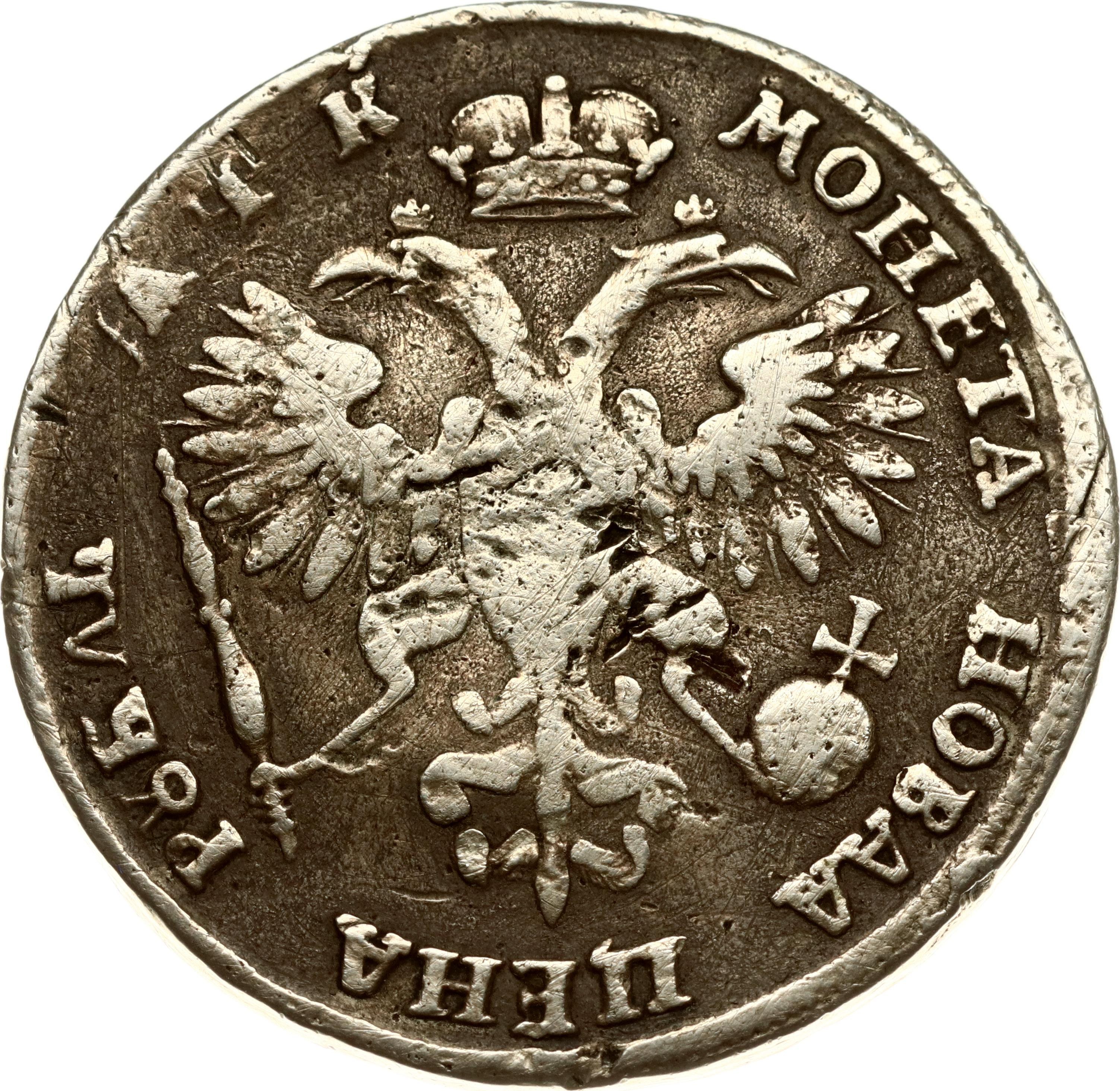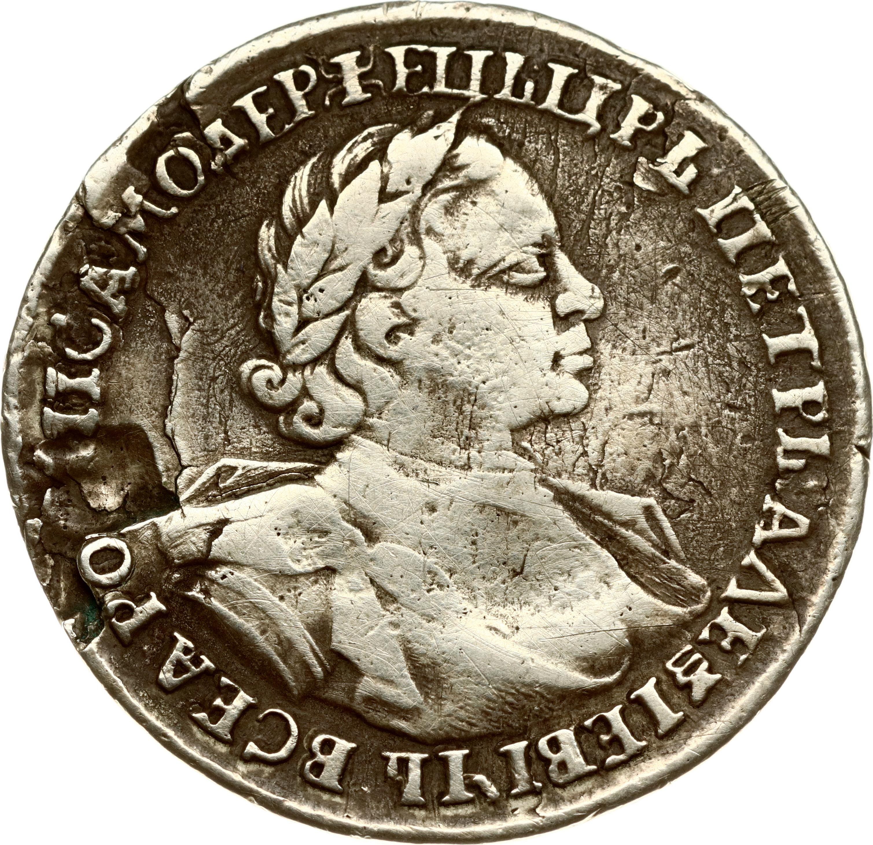 Russia. Peter I (1699-1725). Rouble 1720, Moscow, Kadashewski mint. Variety: portrait in armour, no rivets, without the engraver's initials. Edge partially w/o letters - minting defect. Silver 26.58 g. Bitkin №319 (R); Diakov3S №920 (R1); Uzdenikov 0588; Petrov 4 rub. Field defects on both sides, patina.