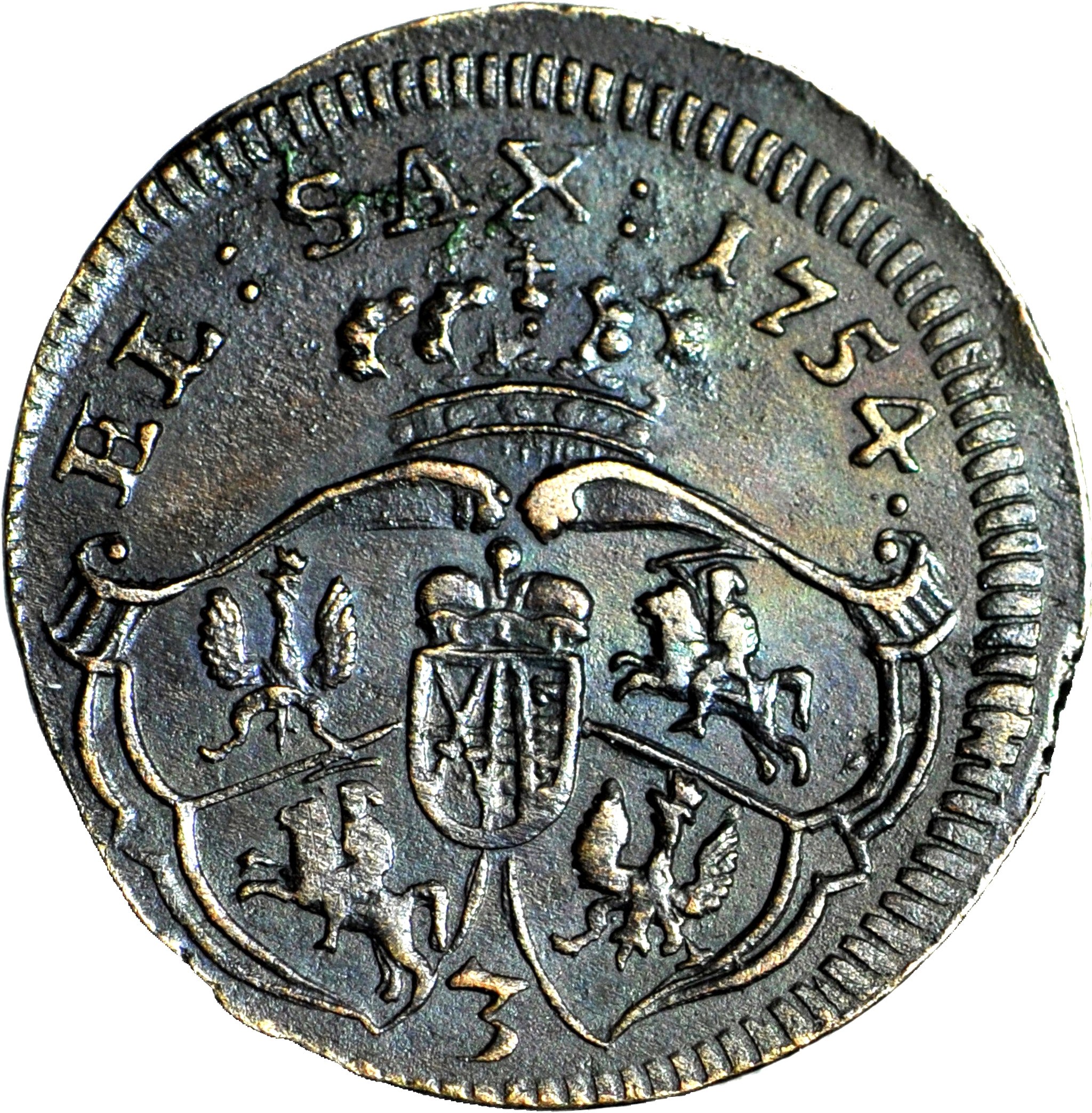 Niezwykle szczegółowej roboty grosz, nie będący, ani emisją z Gubina, ani z Grünthal w literaturze pierwszy raz odnotowany w 2020 przez J. Chałupskiego w książce "Miedziane monety koronne Augusta III". Pięknie profilowane wysmukłe popiersie w zbroi z naramiennikiem zdobionym ćwiekami, na piersiach władcy Order Złotego Runa, na rewersie piękny, bogaty w detale kartusz herbowy z pięknie modelowanymi koronami i herbami. Emisję ze względu na podobieństwa do talarów drezdeńskich (1757, 1763) - charakterystyczna głowa, zdobienie zbroi, naszym zdaniem należy przypisać mennicy drezdeńskiej, tym bardziej, że maszyny mennicze podczas wojny siedmioletniej(podczas, której bito grosze ze wstecznymi datami) zostały przewiezione z mennic w Grünthalu i w Gubina do Drezna. Duża rzadkość mogąca stanowić ozdobę zbioru zaawansowanego zbioru monet miedzianych!