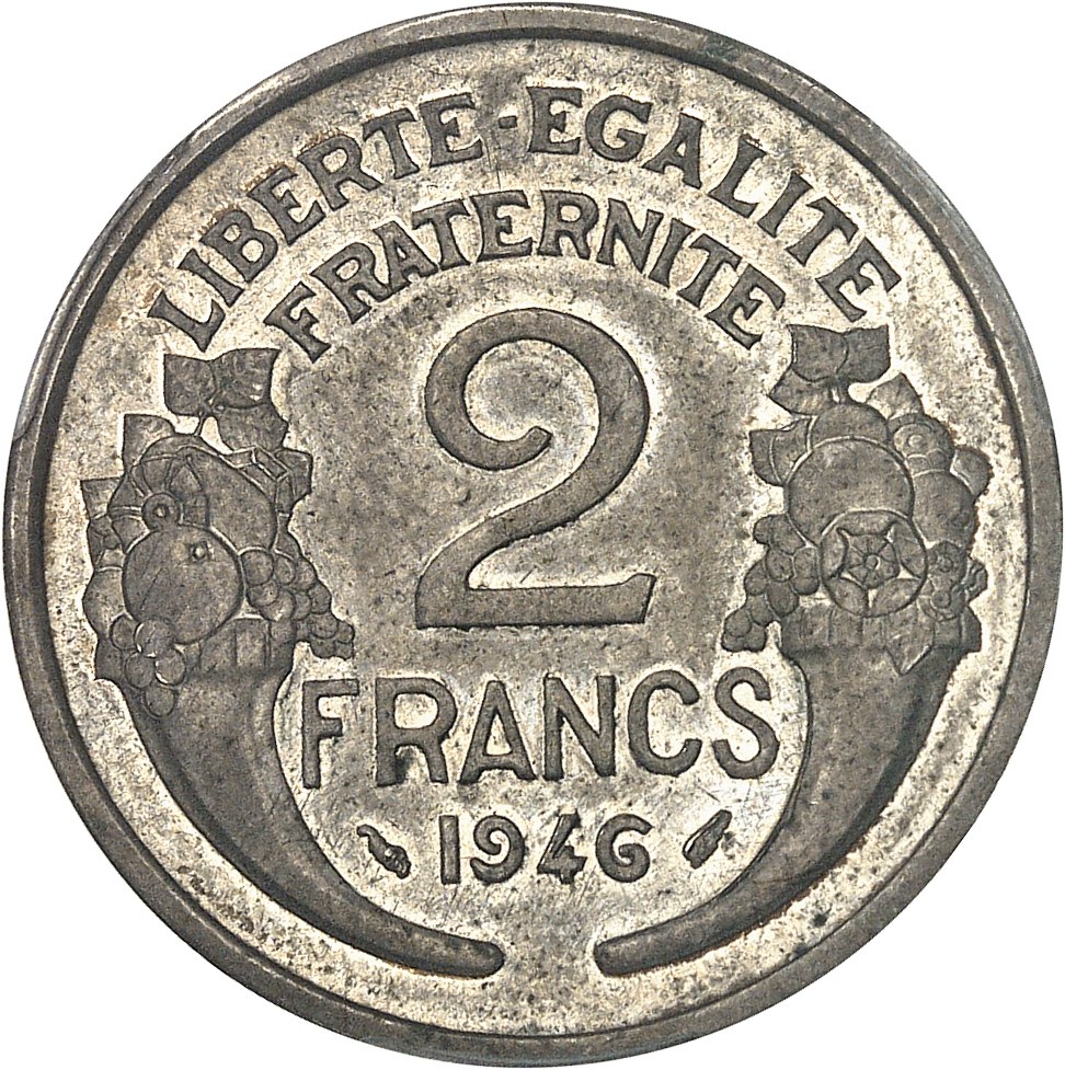 Gouvernement provisoire de la République française (1944-1946). Épreuve de 2 francs Morlon en argent à 700 ‰, Frappe spéciale (SP) 1946, Paris. PCGS SP63 (38773472).