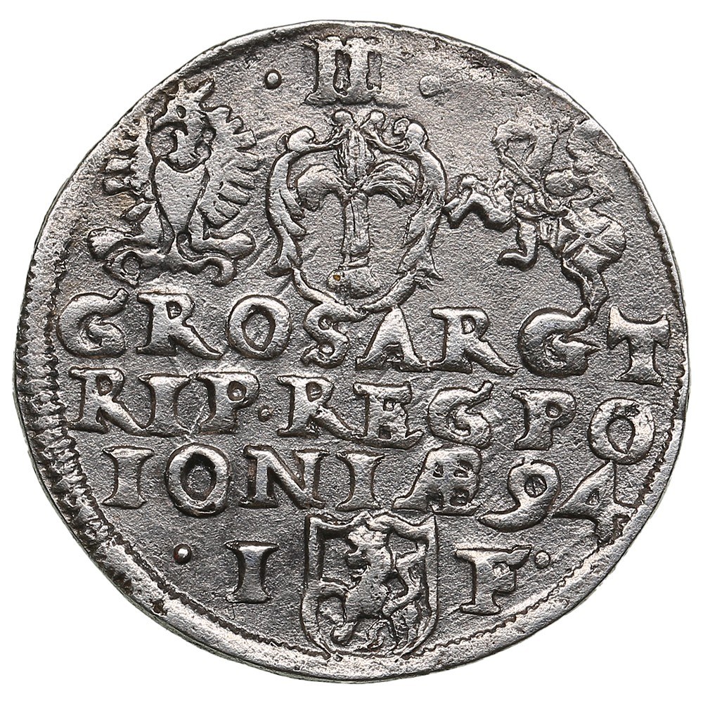 Rev.: Vasa arms between Polish and Lithuanian arms, above, ·III·; legend in three lines “GROS·ARG T-RIP·REG·POIONIÆ 94”, below, Lewart arms of crown treasurer Jan Firley with initials ·I-F·.