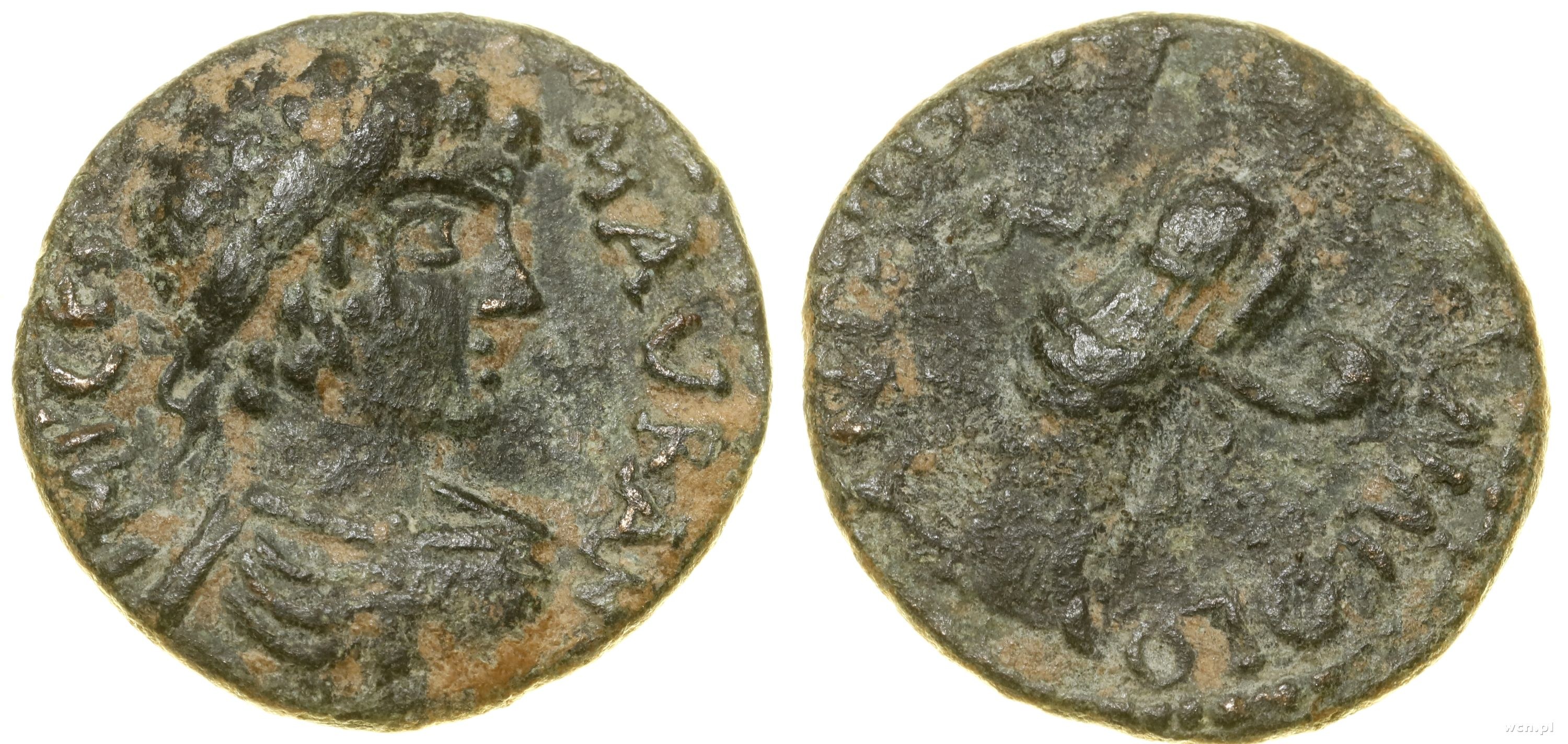 Aw: Popiersie władcy w prawo, IMP CES M AVR AN, Rw: Tyche lub Fortuna na wprost, trzymająca gałązkę oliwną oraz róg obfitości, ANT[IOCH] [FORTV]NA COLO