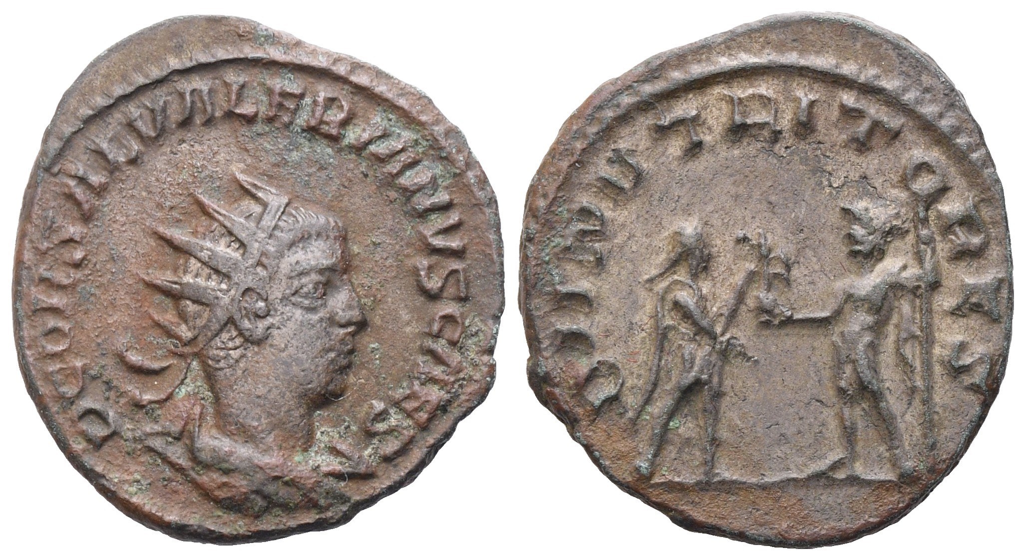 COR SAL VALERIANVS CAES Radiate and draped bust r.; Rv. DII NVTRITORES Jupiter standing l., holding sceptre and presenting Victory to emperor standing right. RIC V 35; MIR 1606e. Very fine.