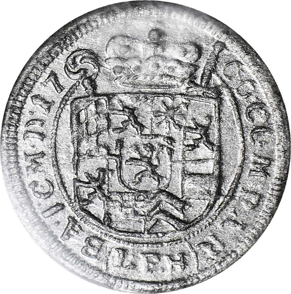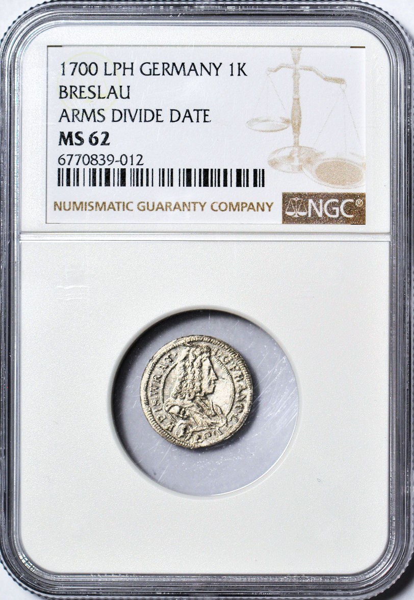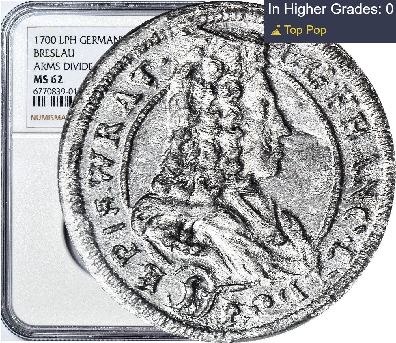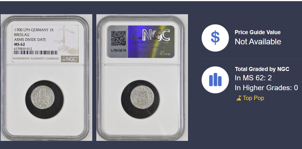 Najwyższa nota gradingowa w NGC. Rzadki nominał, rzadziej spotykany na rynku typ z datą w otoku zamiast po bokach tarczy. Księstwo Nyskie Biskupów Wrocławskich. Menniczy egzemplarz, mocny połysk, wspaniałe detale, nota numeryczna jest wielką rzadkością dla monet wybitych ze słabego srebra bulionowego.
