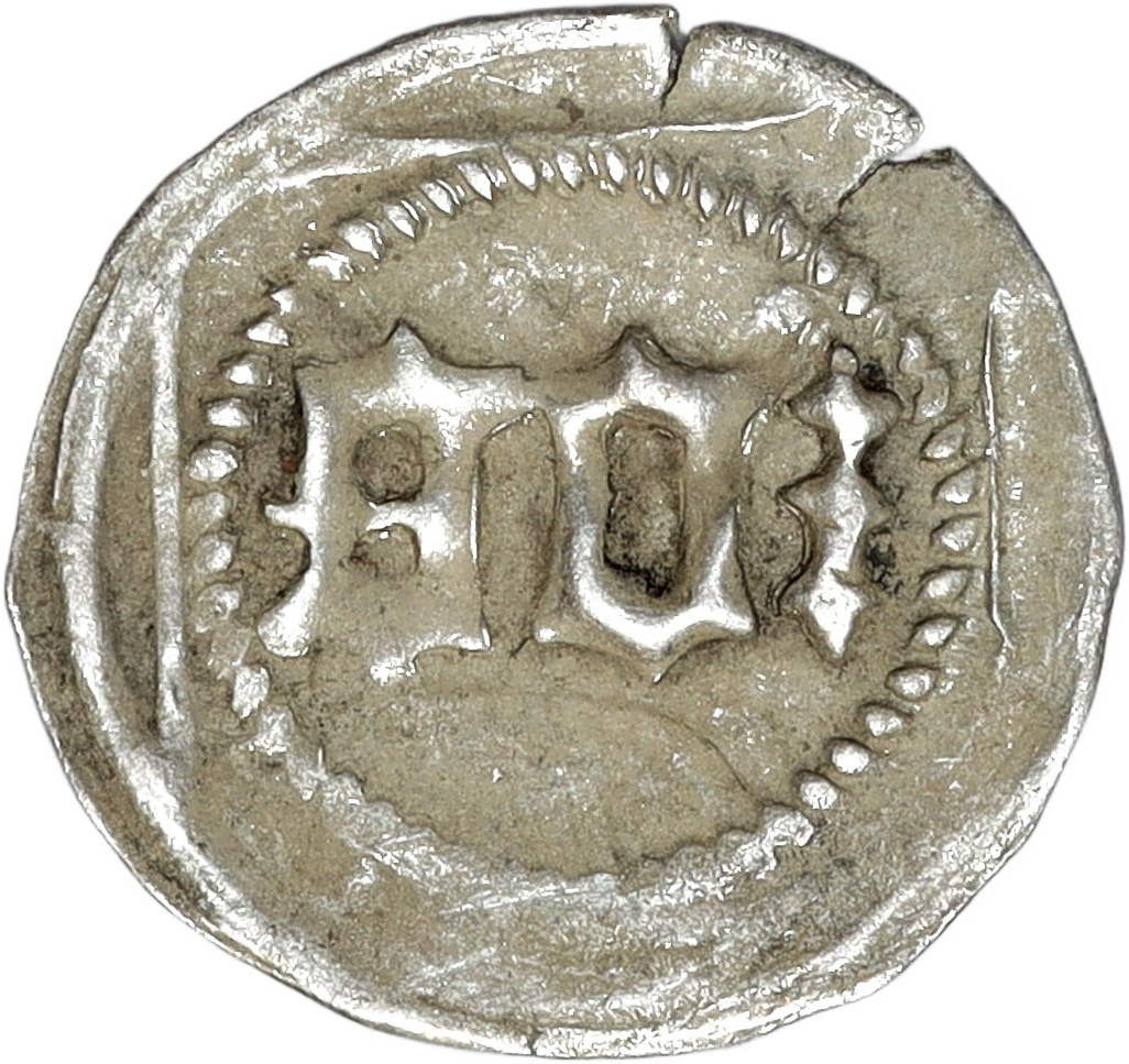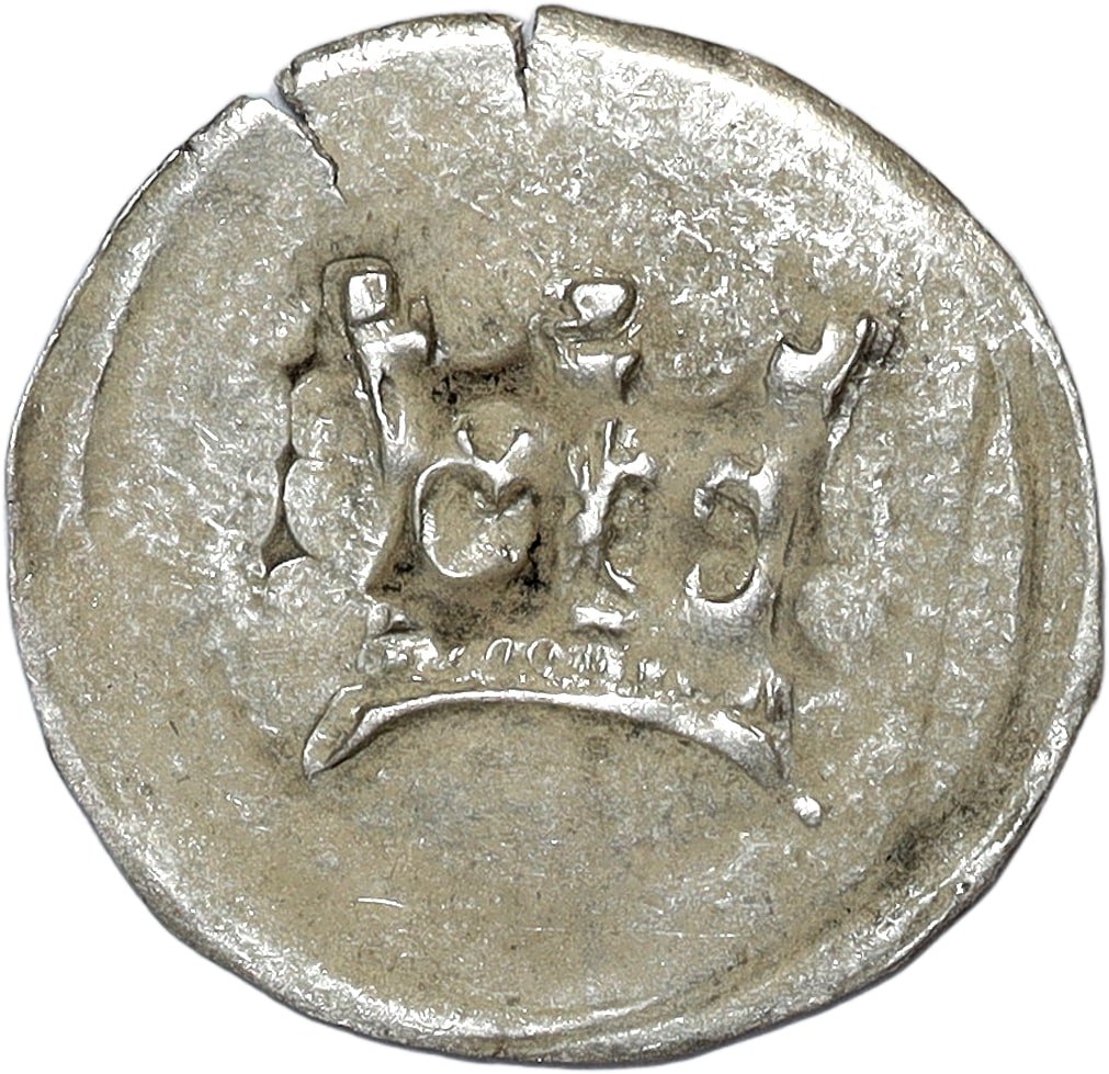 Srebro. Gotyckie litery GOR w sznurowej obwódce, na rewersie korona. Mennica Zgorzelec, XV wiek.