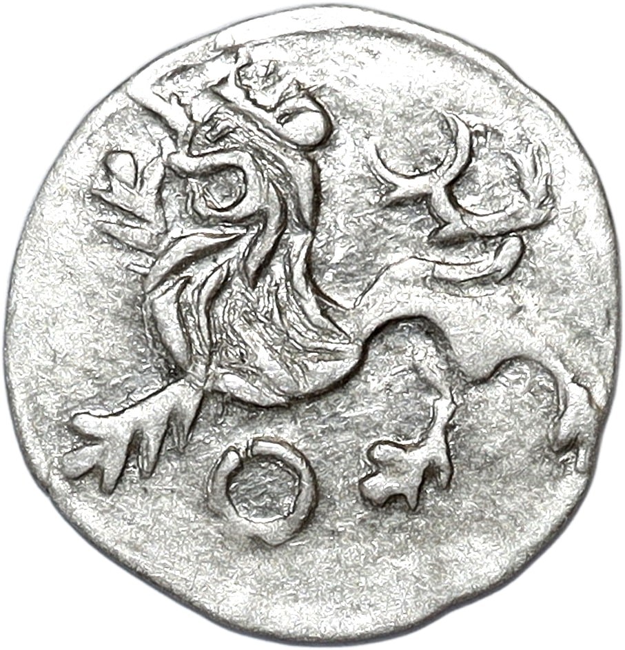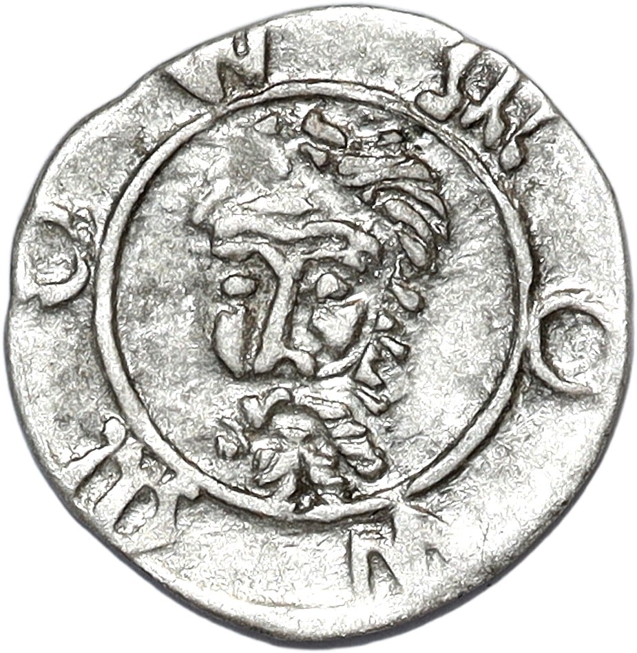Srebro. Głowa świętego Jana, w otoku litery, na rewersie Lew czeski kroczący w lewo, pod nim księżyc,