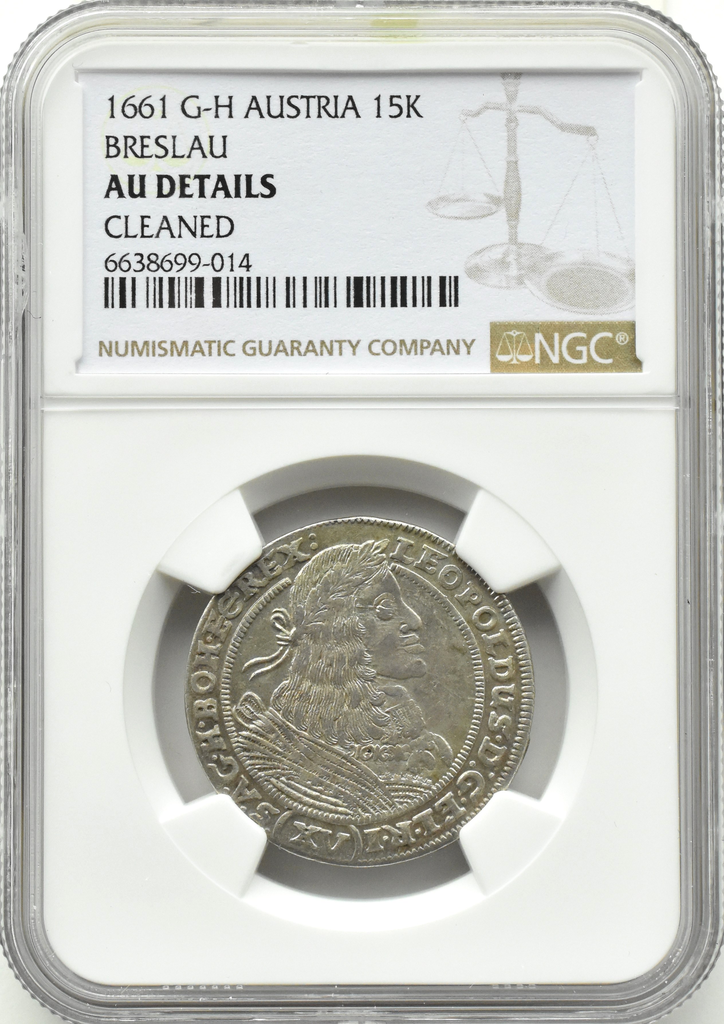Śląsk, Leopold I, 15 krajcarów 1661 GH, mennica Wrocław, NGC AU Details