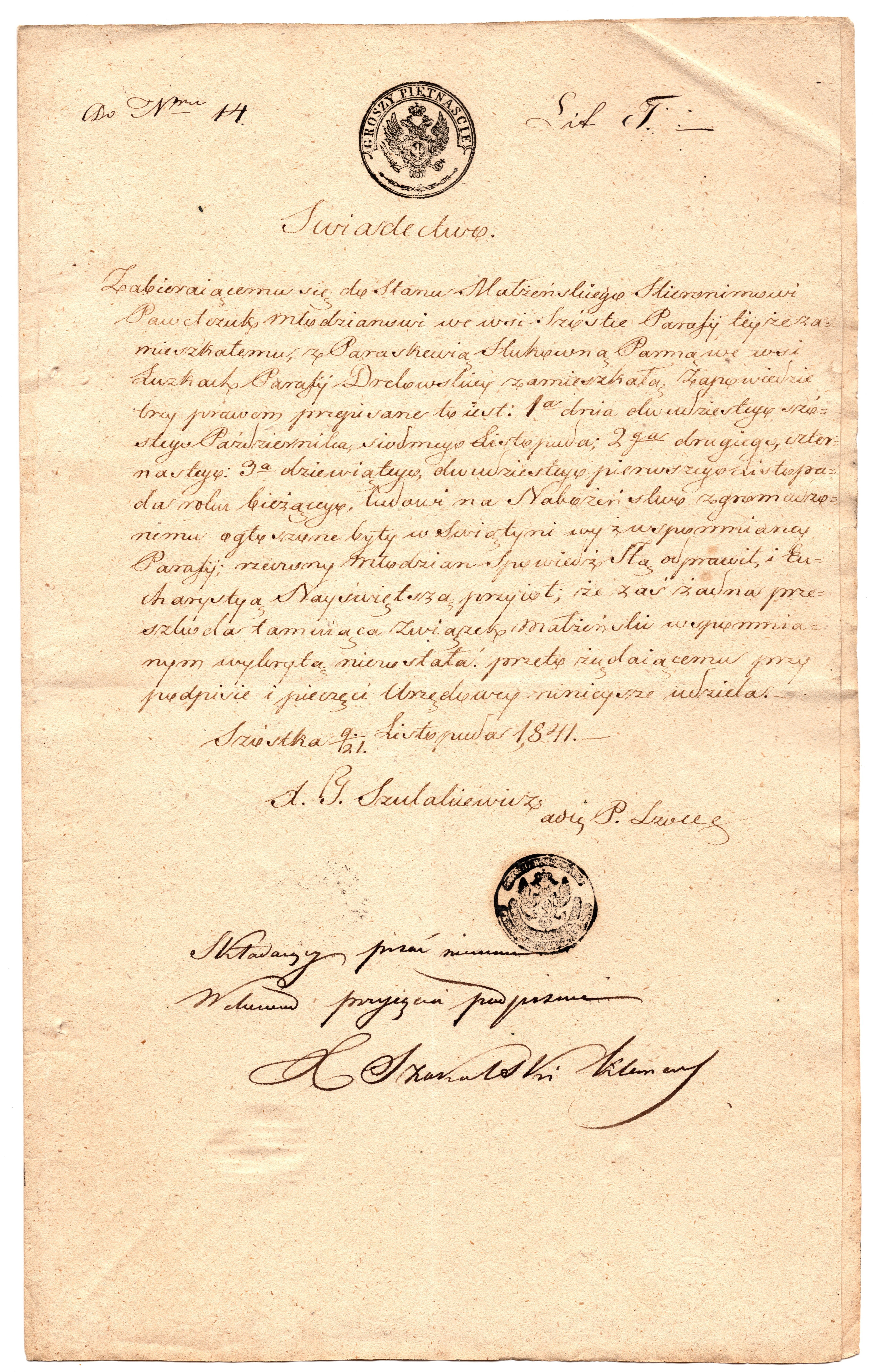 • Typ dokumentu: Świadectwo małżeństwa, spisane ręcznie, z pieczęciami i podpisami duchownych oraz nowożeńców.
