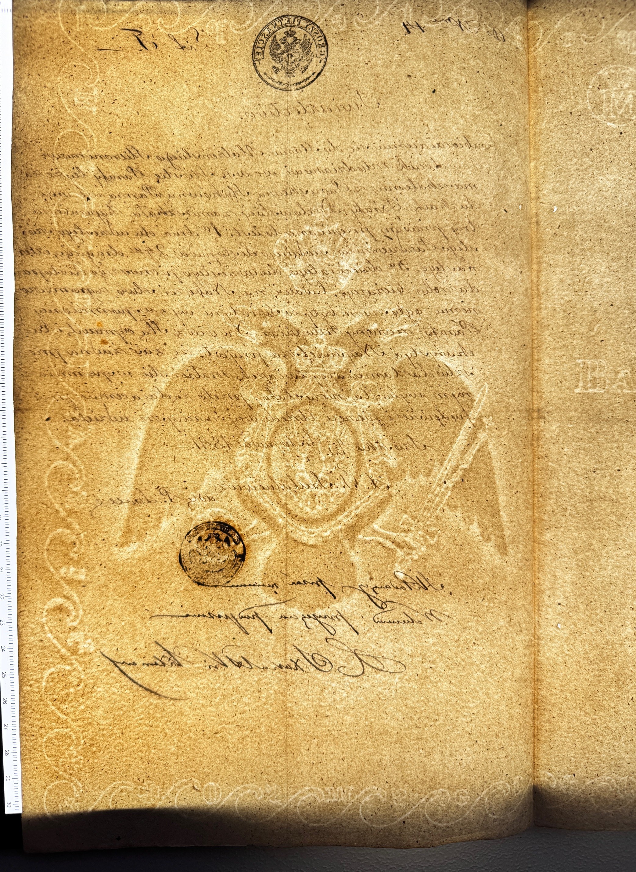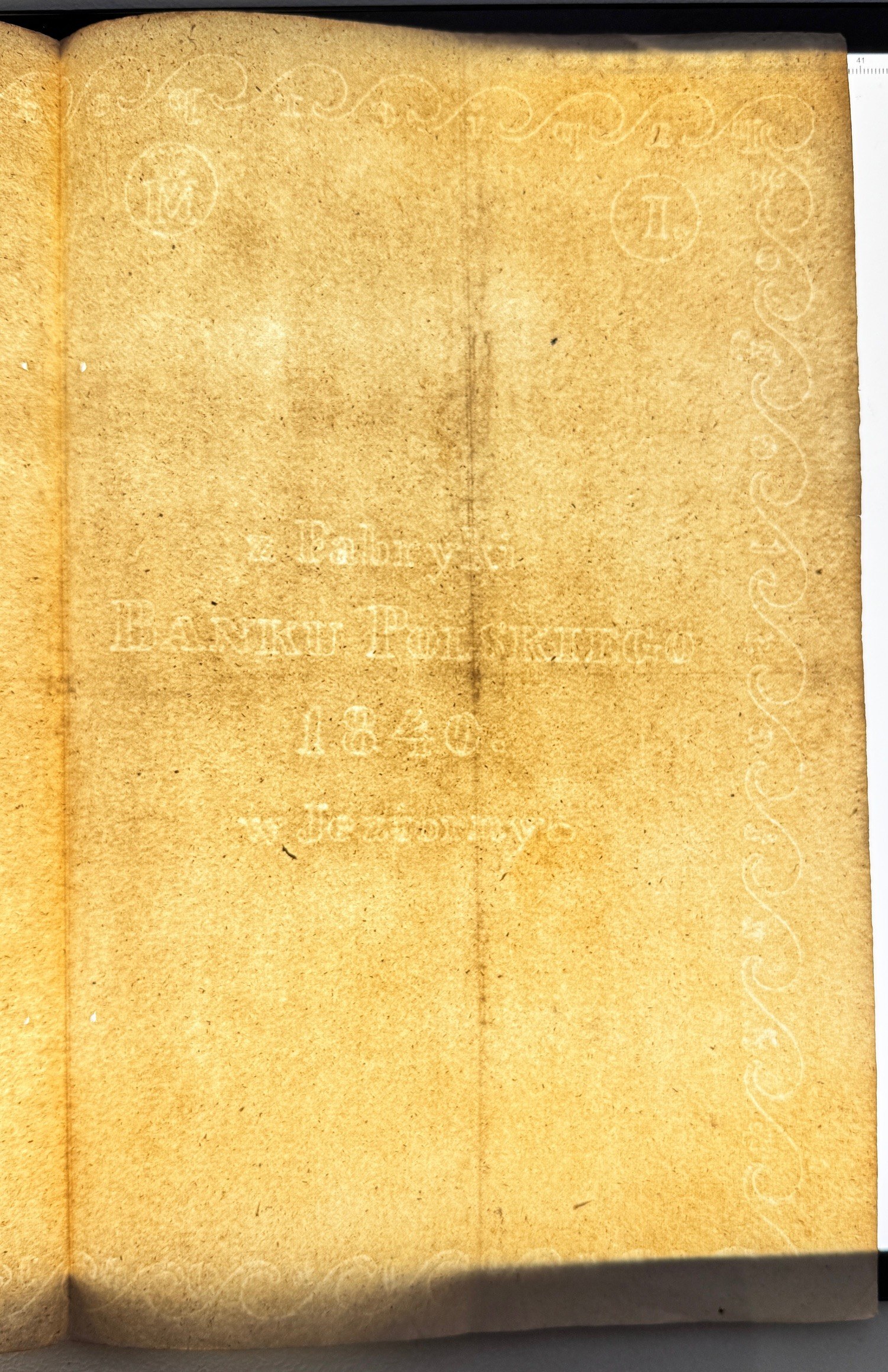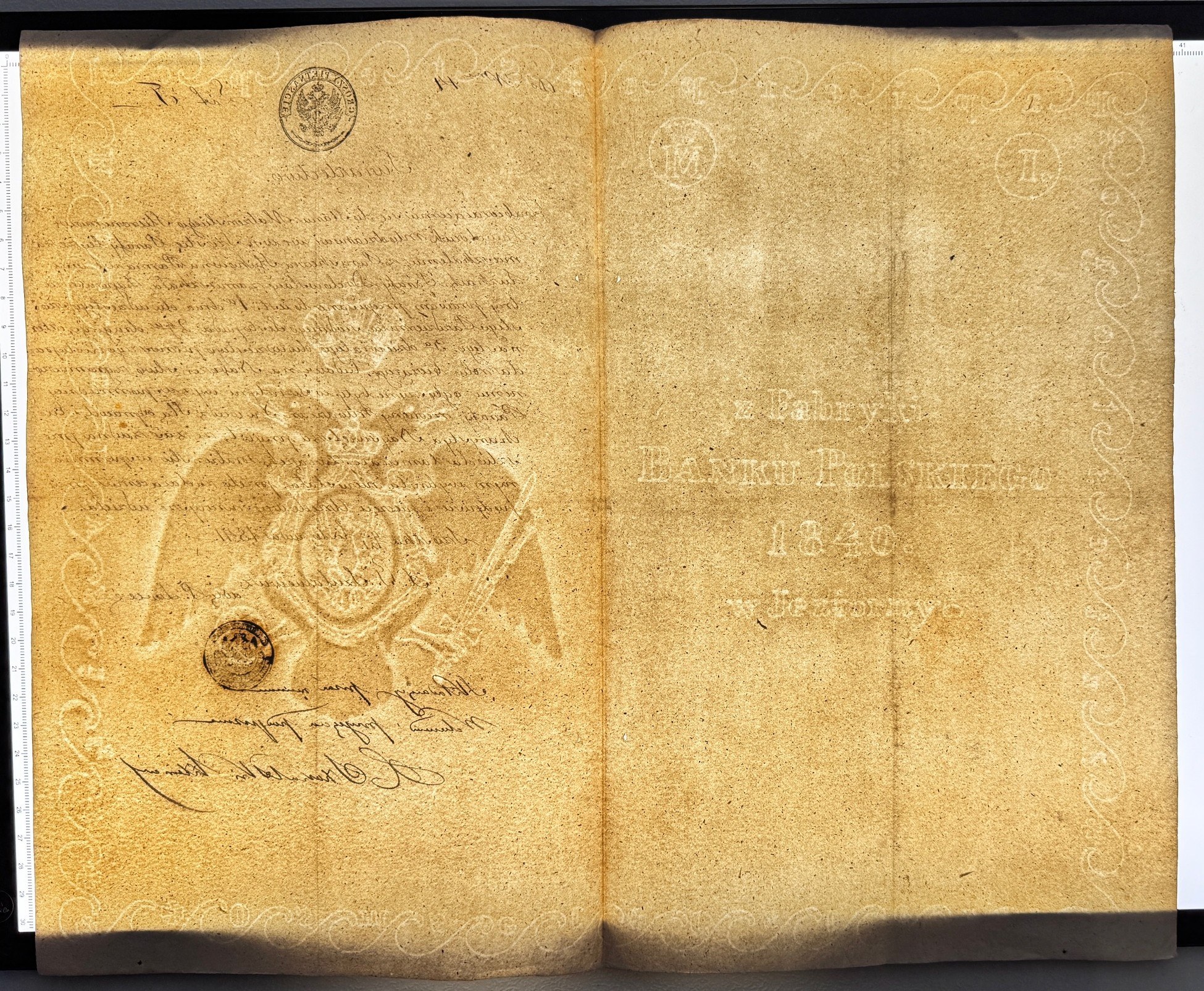 Dokument sporządzony na papierze ze znakami wodnymi " Z fabryki Banku Polskiego 1840 w Jeziorny".