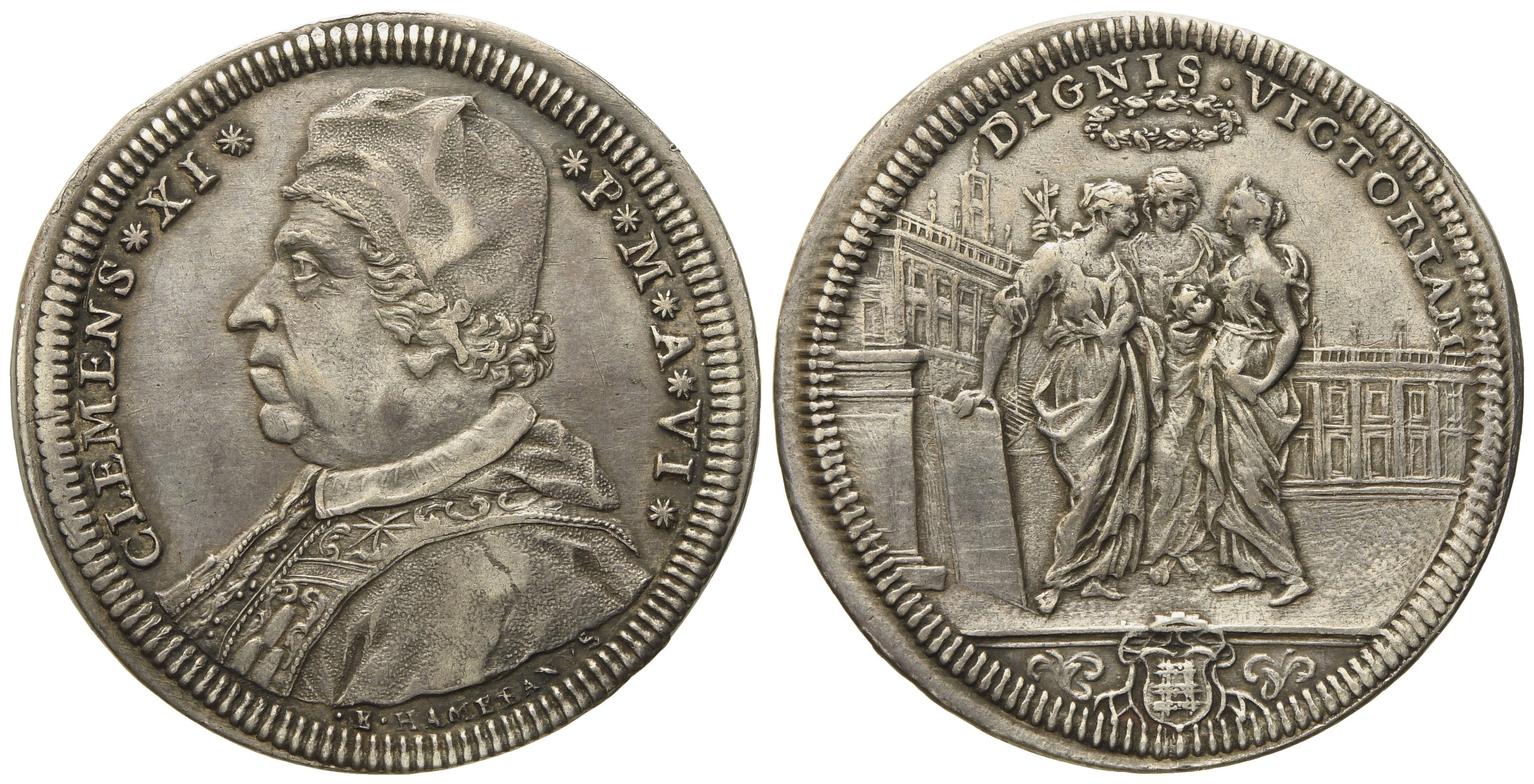 STATO PONTIFICIO. Roma. Clemente XI (1700 - 1721). Testone anno VI "Le tre allegorie". Ag (9,1 g; 33,3 mm)