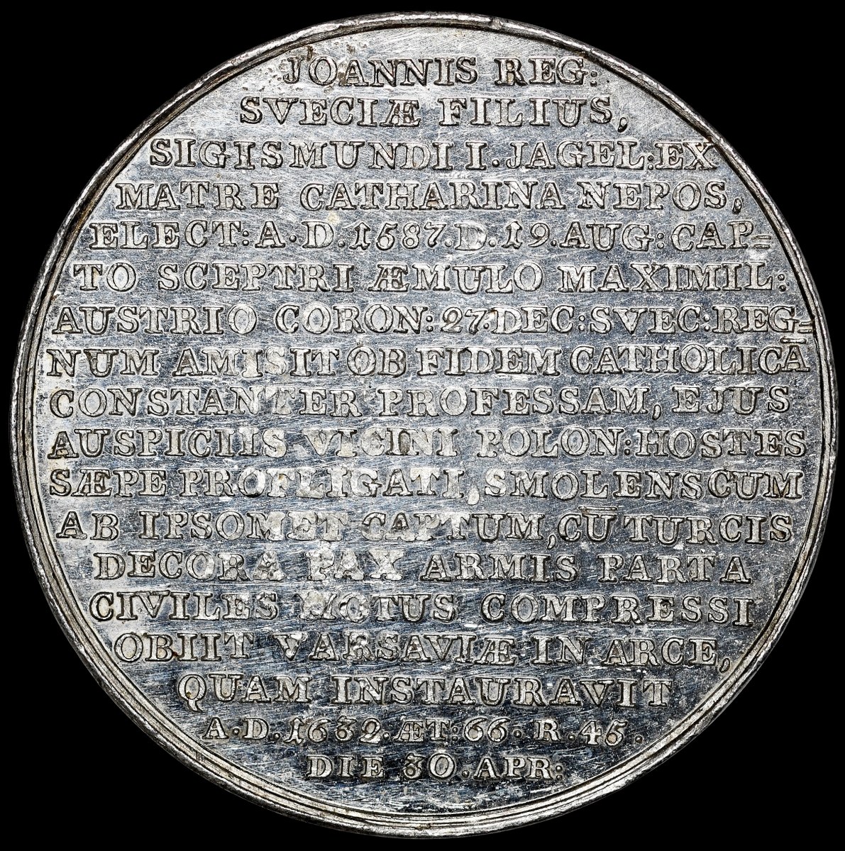 Napis w osiemnasty wierszach: IOANNIS REG / SVECIÆ FILIUS / SIGISMUNDI I JAGEL EX