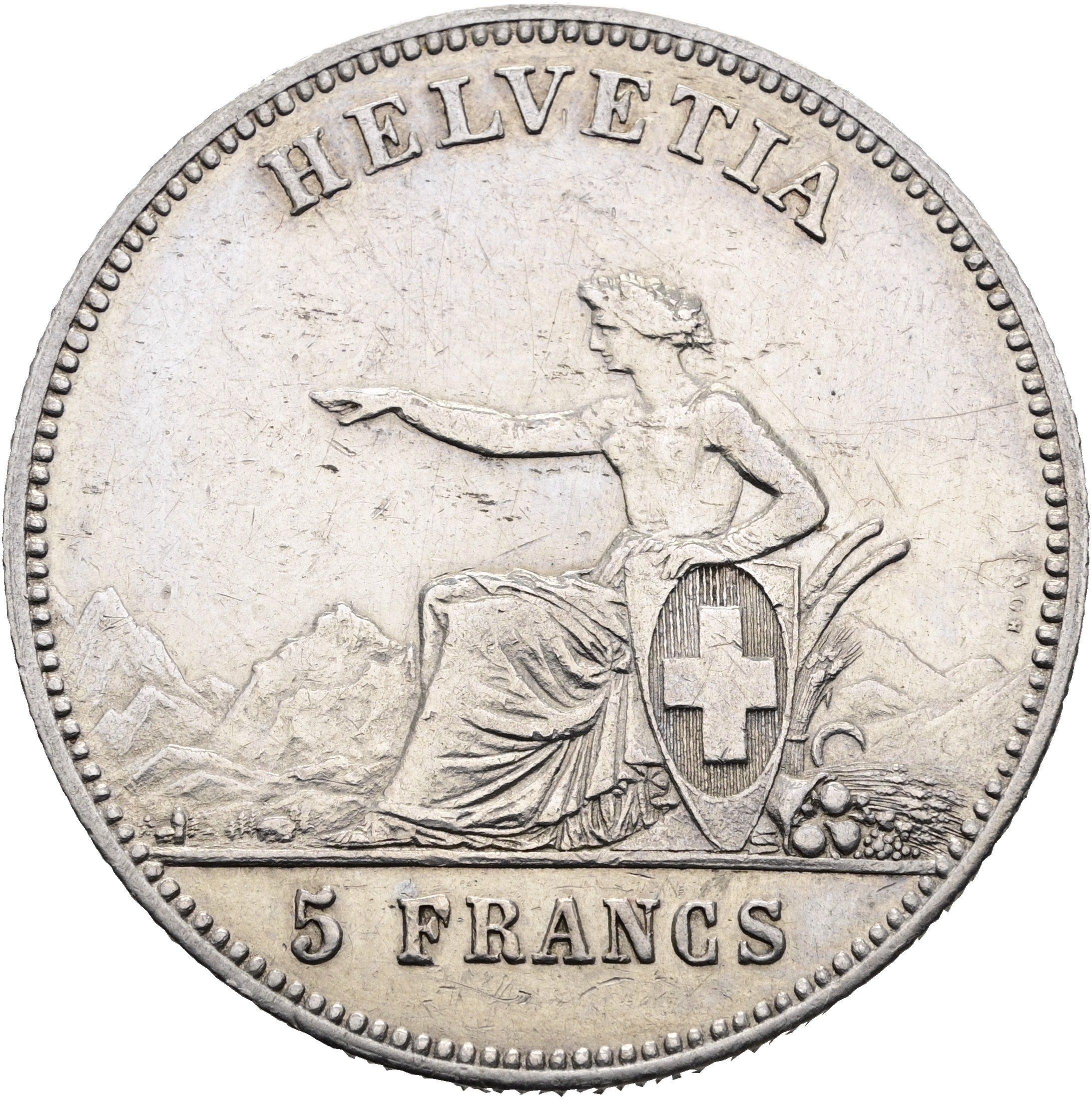 Silber-Schützentaler 5 Franken auf das Eidgenössische Schützenfest in La Chaux-de-Fonds 1863, Tir fédéral (Schützenmedaillen Richter 944a)