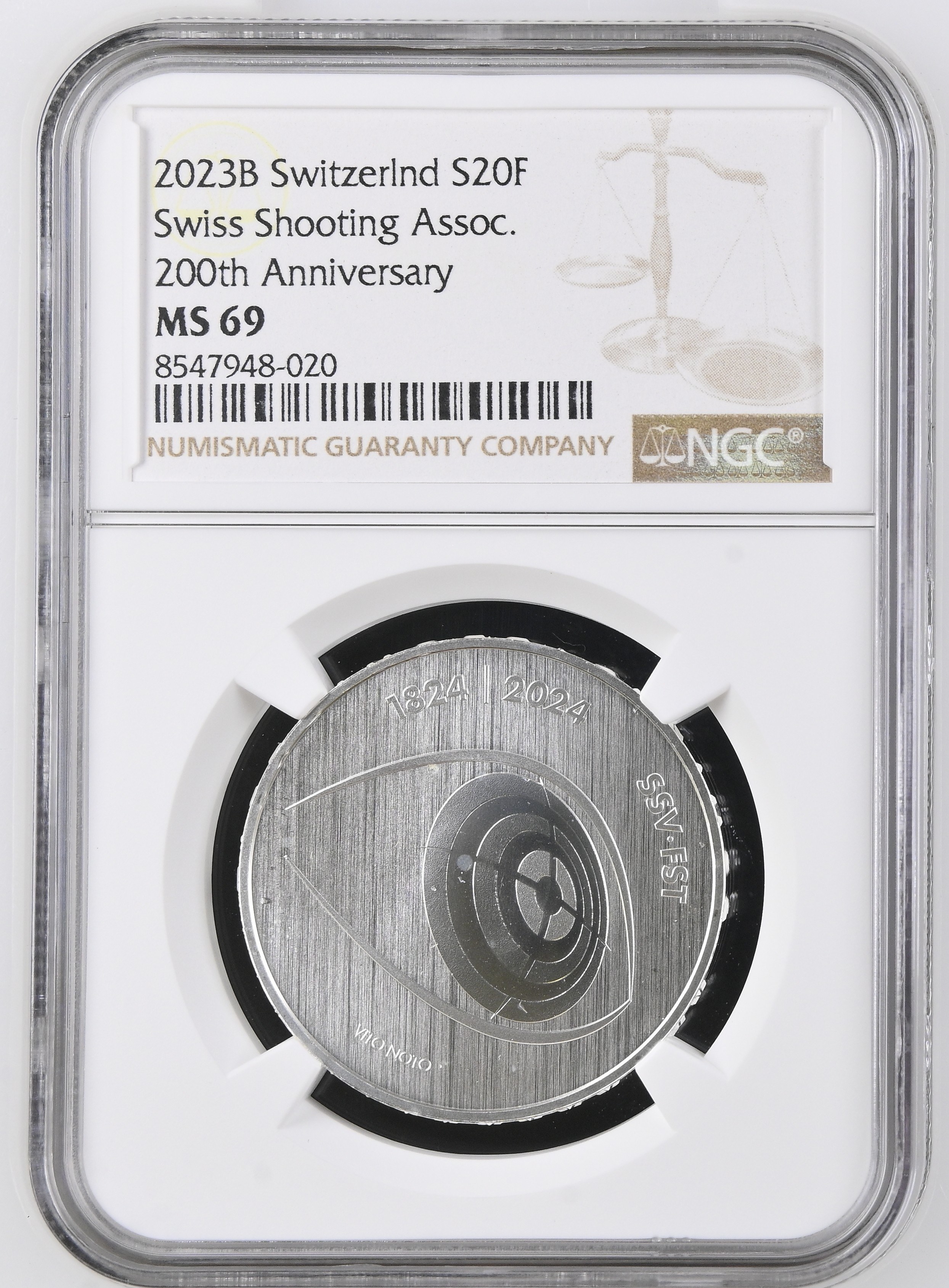 Silbermünze / Schützentaler 20 Franken 2023 auf das 200-jährige Jubiläum des Schweizer Schiesssportverbandes (SSV) 1824–2024. Unzirkuliert 15’000 Exemplare. Bewertet von NGC mit MS 69.