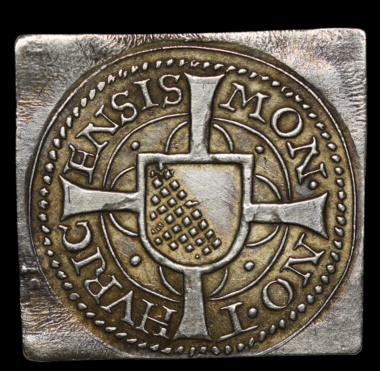 Awers: W centralnej części krzyża herb miasta, wokoło napis MON / NO T / HVRIC / ENSI