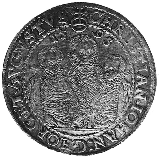 Christian II, Jan Georg i August 1591-1611, talar 1595, Aw: Półpostacie 3 braci i napis, Rw: Ozdobna tarcza herbowa i napis, Merseb.776, Dav.9820