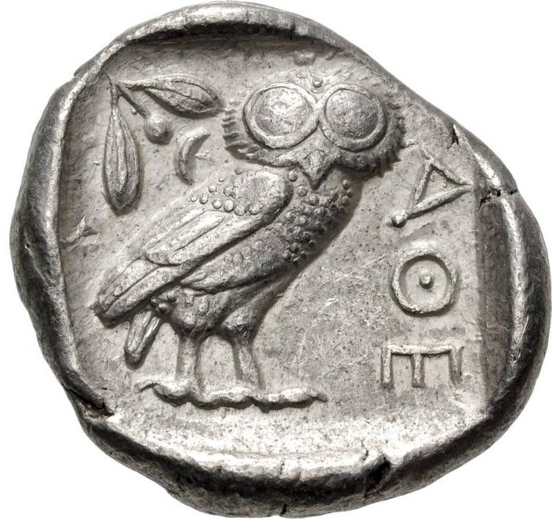 Rewers: Sowa stojąca w prawo, z głową na wprost, z lewej gałązka oliwna i półksiężyc, z prawej legenda ΑΘΕ.