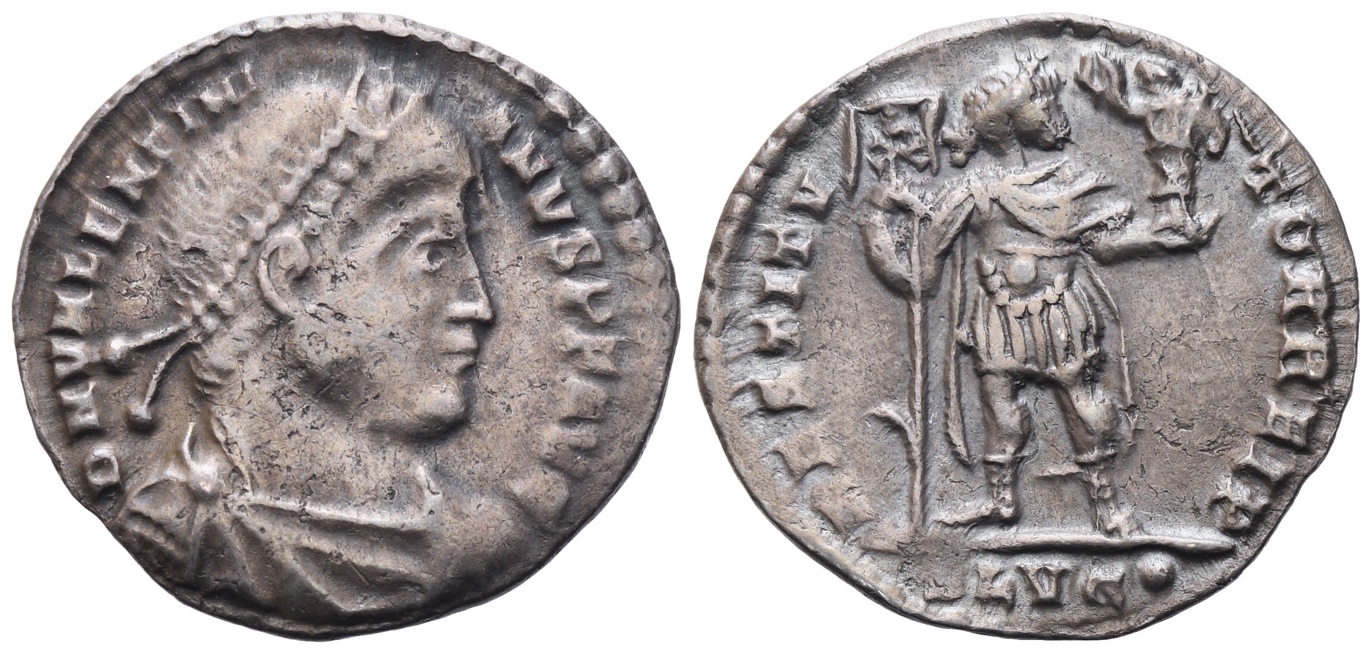 Pearl-diademed, draped, and cuirassed bust r.; Rv. Valentinian standing right, holding labarum and Victory on globe; SLVG. RIC IX 43, 6a. gVF
