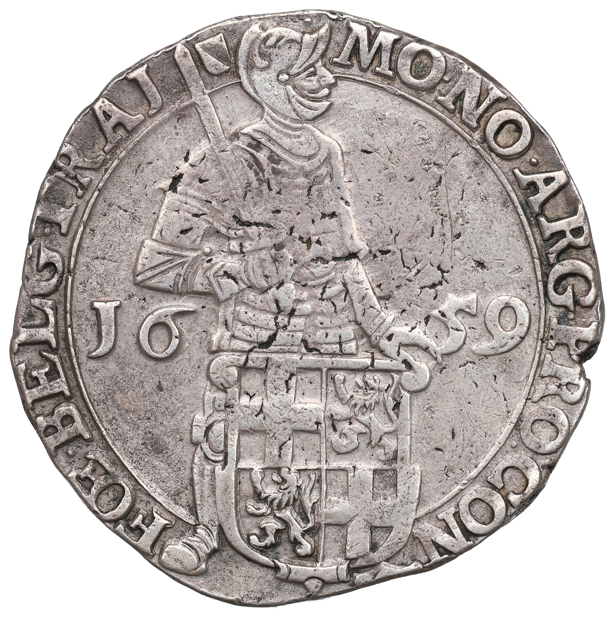 Awers: rycerz stojący w prawo, trzyma miecz i tarczę z herbem, po jego bokach data 16-59, w otoku legenda: