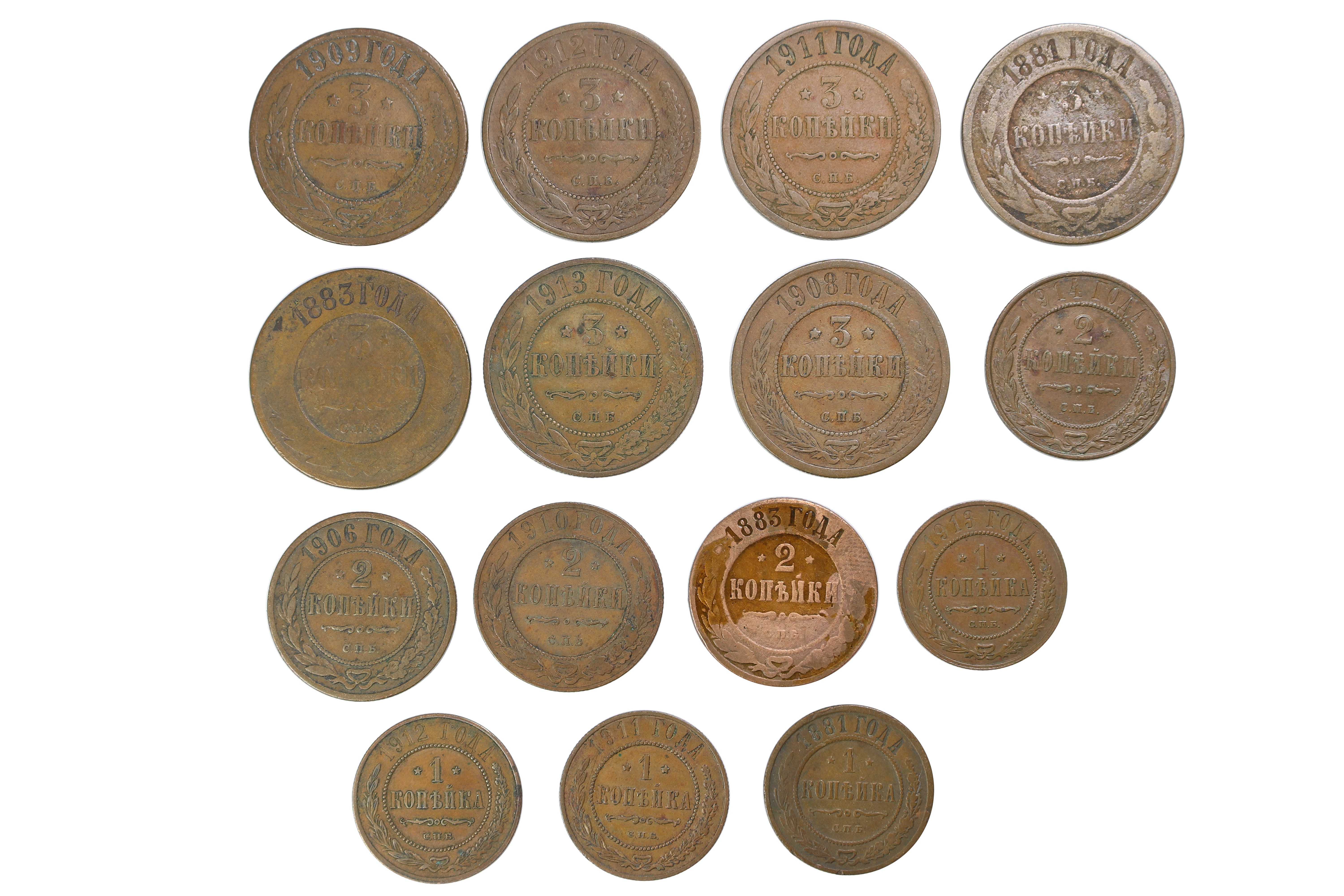 Zestaw zawiera: 1 kopiejka - 1881, 1911, 1912, 1913; 2 kopiejki - 1883, 1906, 1910, 1914; 3 kopiejki - 1881, 1883, 1908, 1909, 11911, 1912, 1923