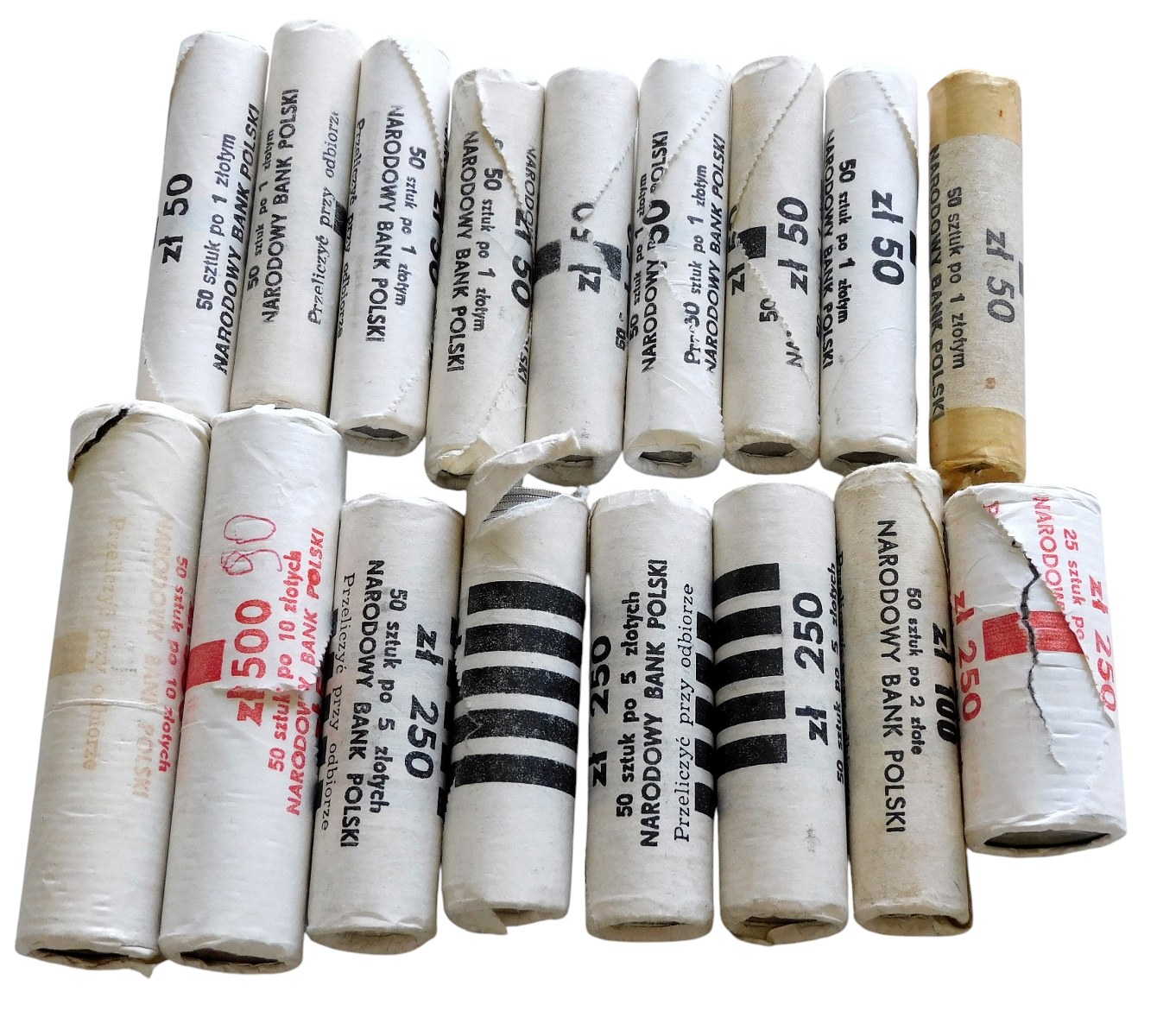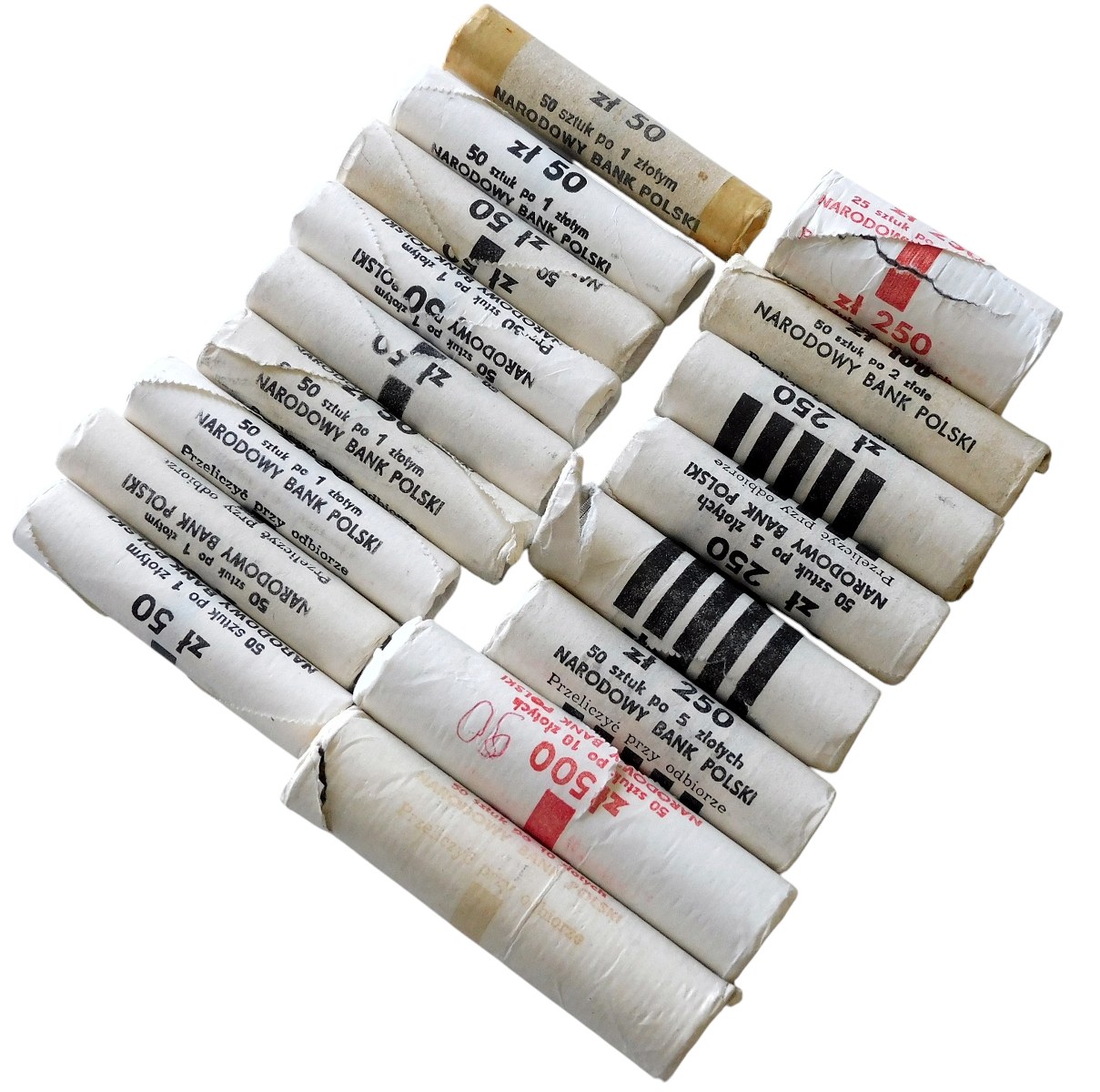 Monety w nieotwieranych rolkach, kilka rolek naddartych jak na zdjęciach.
