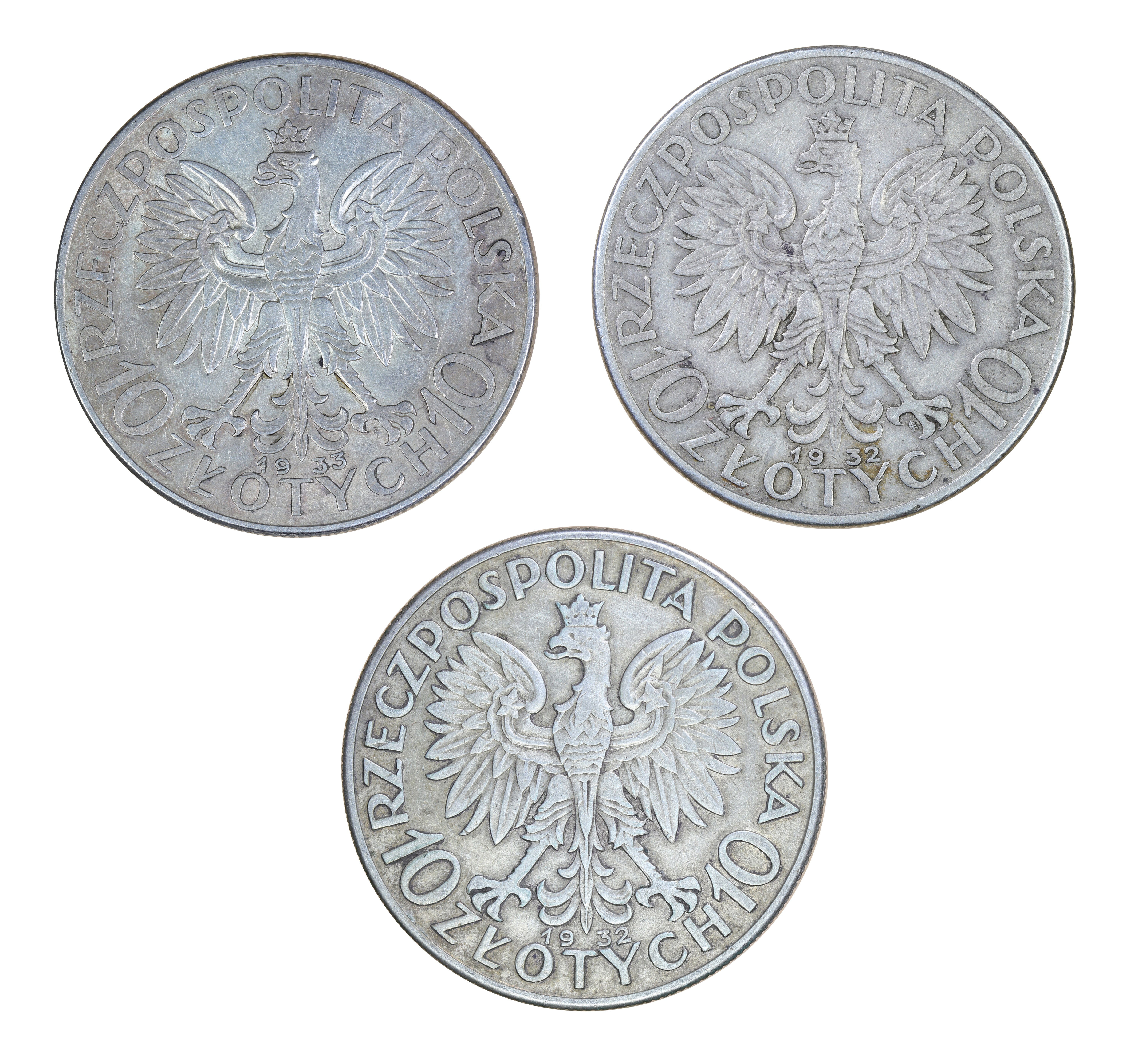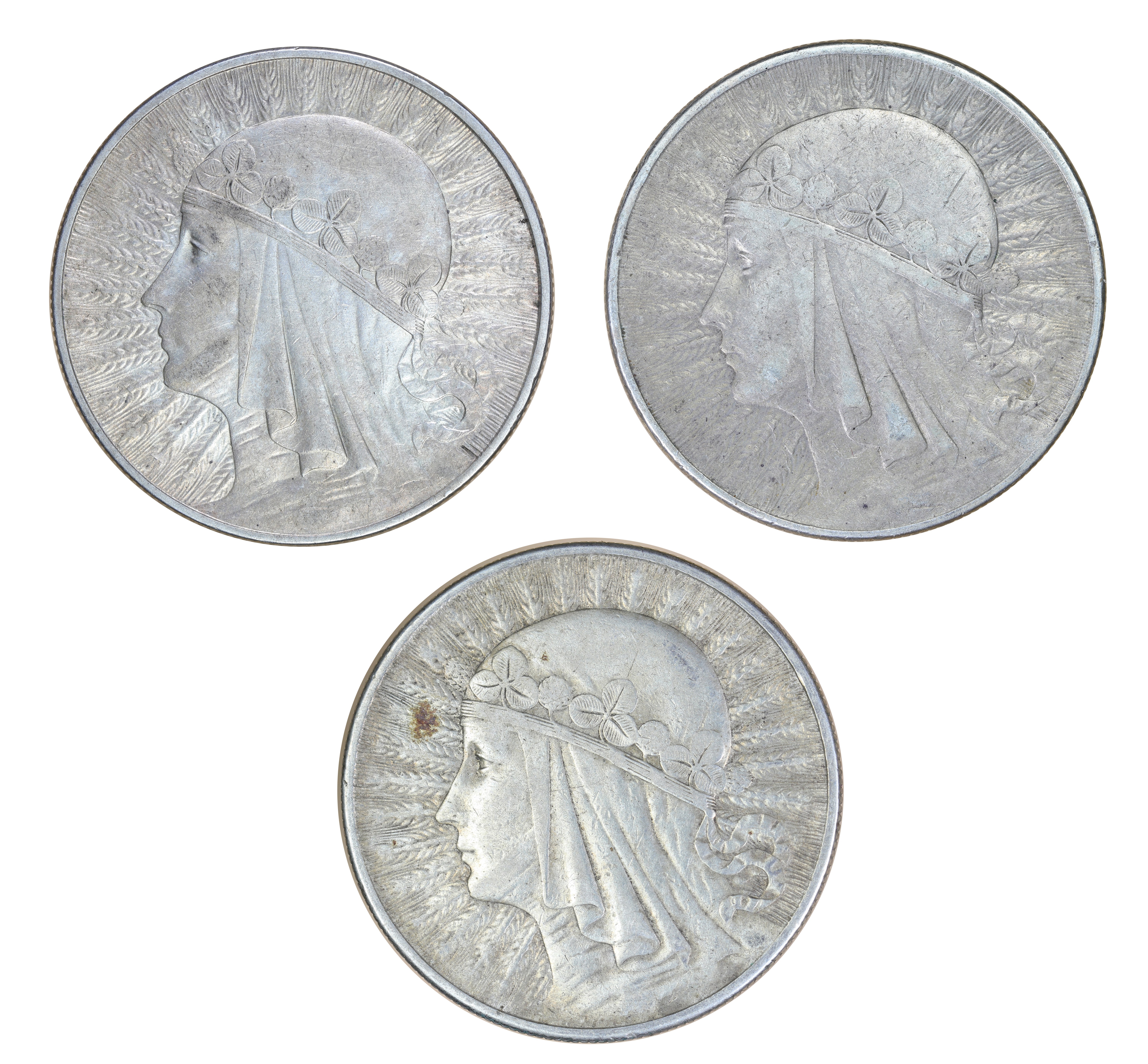 Zestaw 3 szt. 10 złotych, głowa kobiety, II Rzeczpospolita Polska 1923-1929