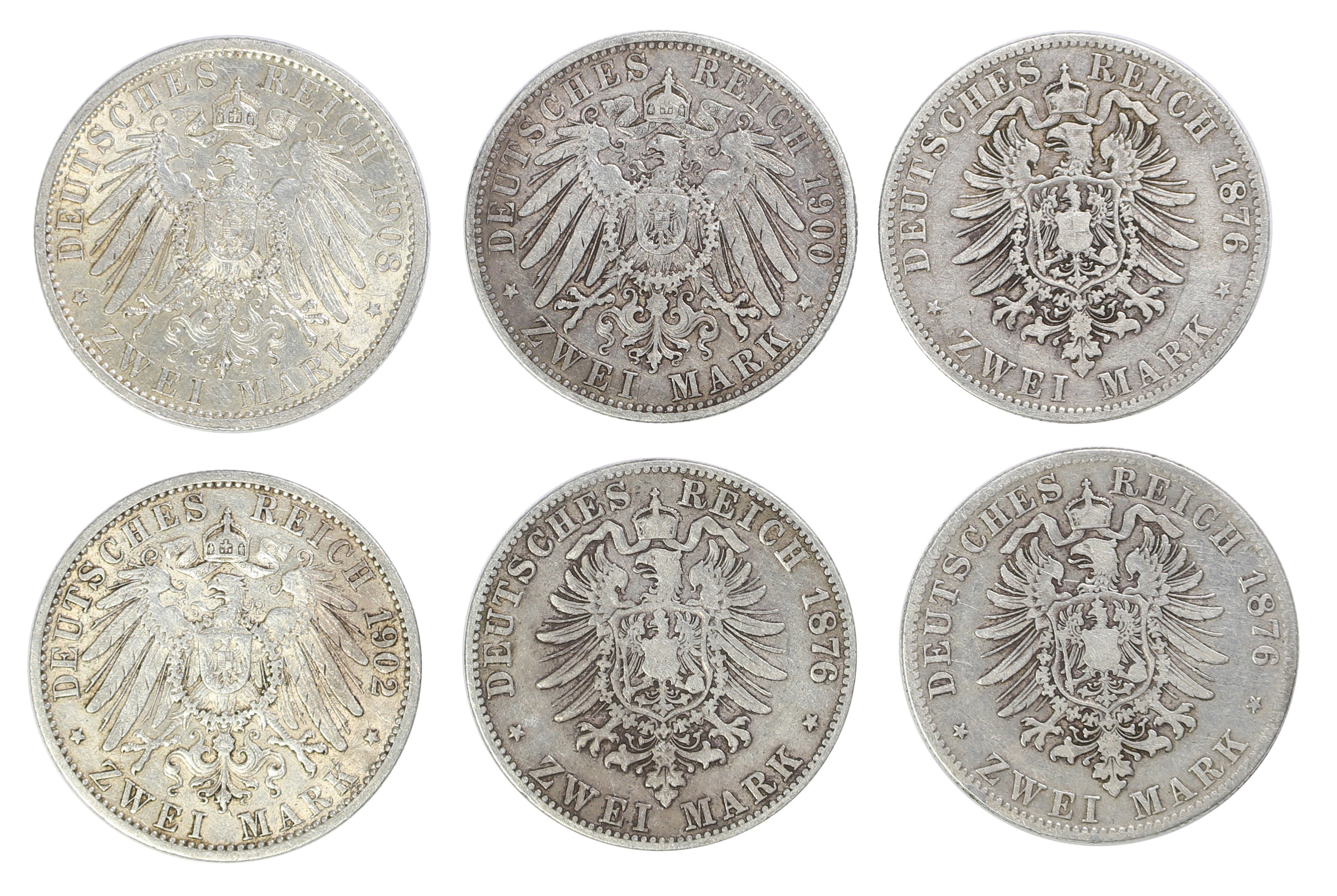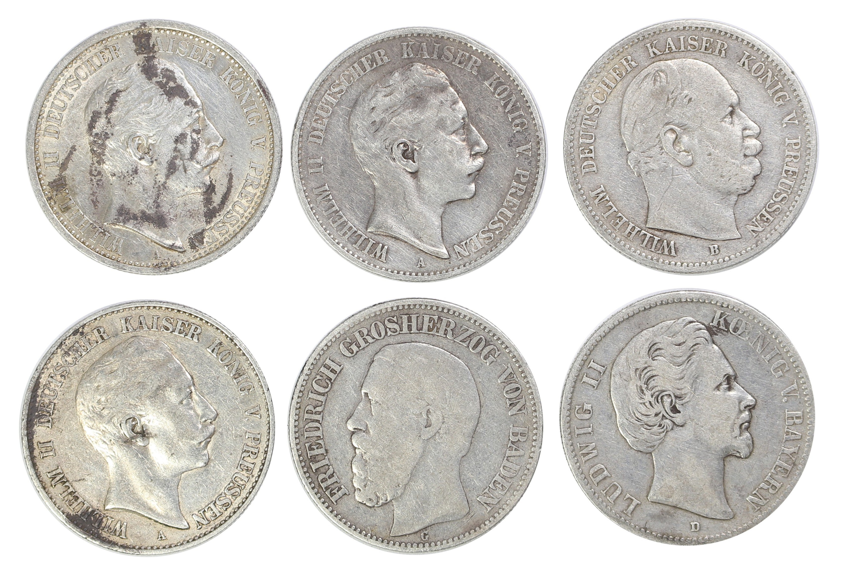 Srebro, zestaw zawiera dwumarkówki: 1876 G - Badenia, 1876 D - Bawaria, 1876 B - Prusy, 1900 - Prusy, 1902 - Prusy, 1908 - Prusy