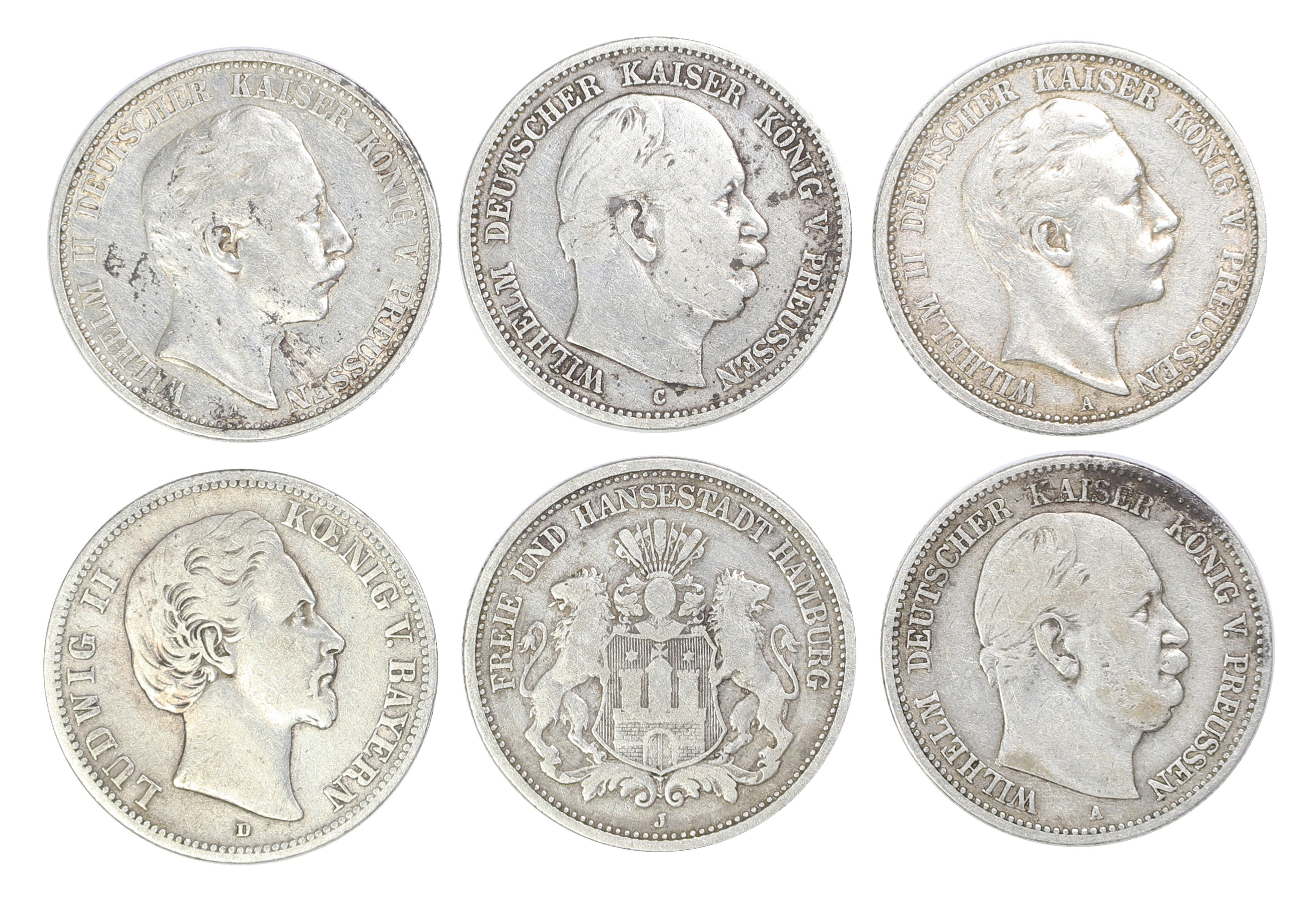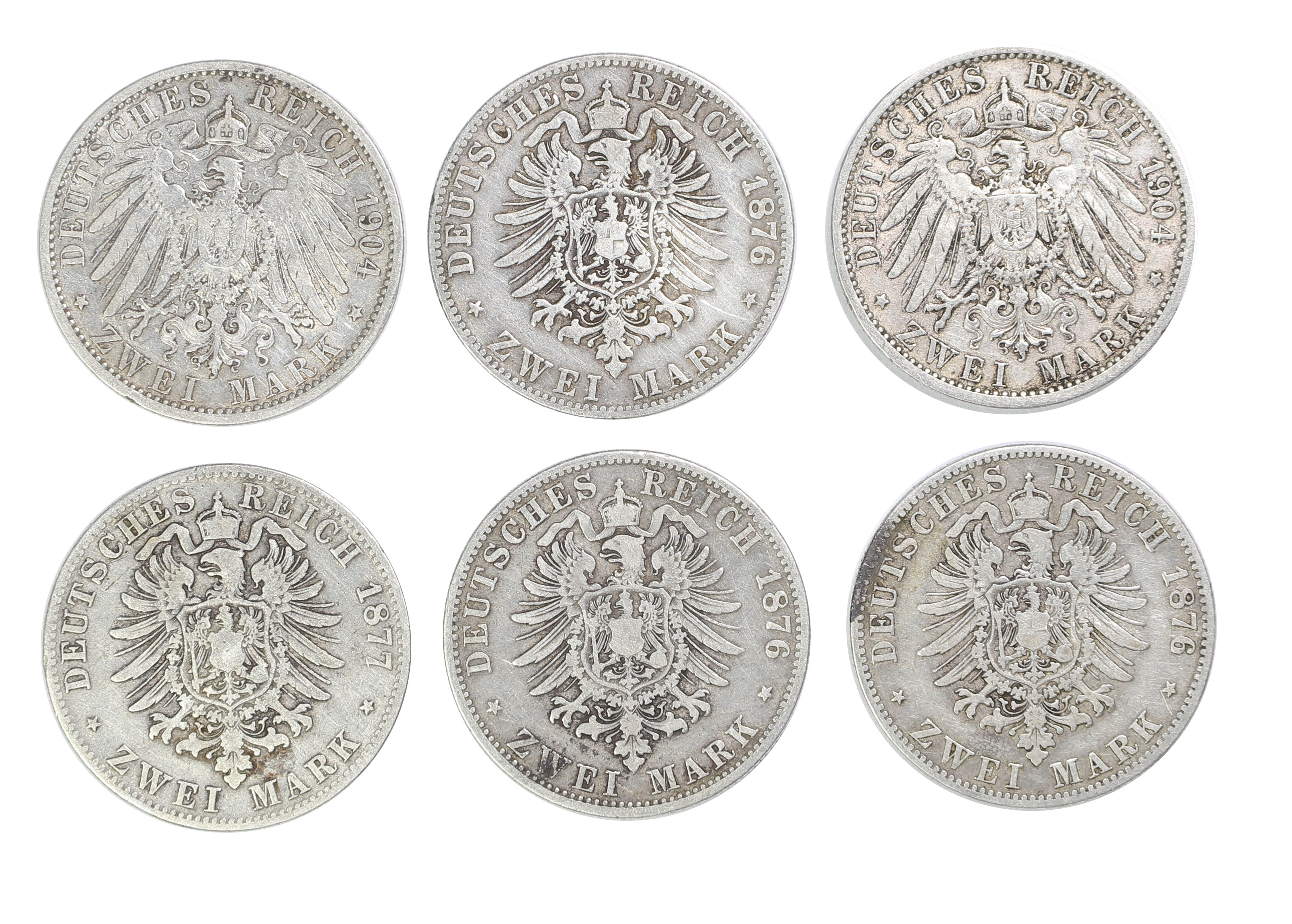 Srebro, zestaw zawiera dwumarkówki: 1877 D - Bawaria, 1876 J - Hamburg, 1876 A - Prusy, 1876 C - Prusy, 1904 - Prusy (2 szt.)