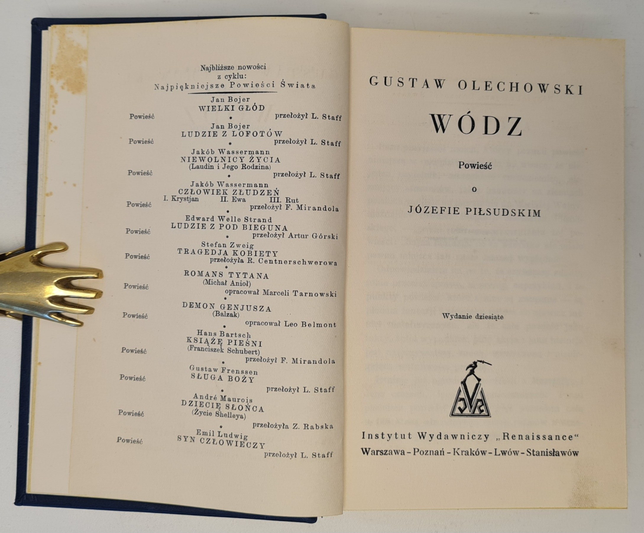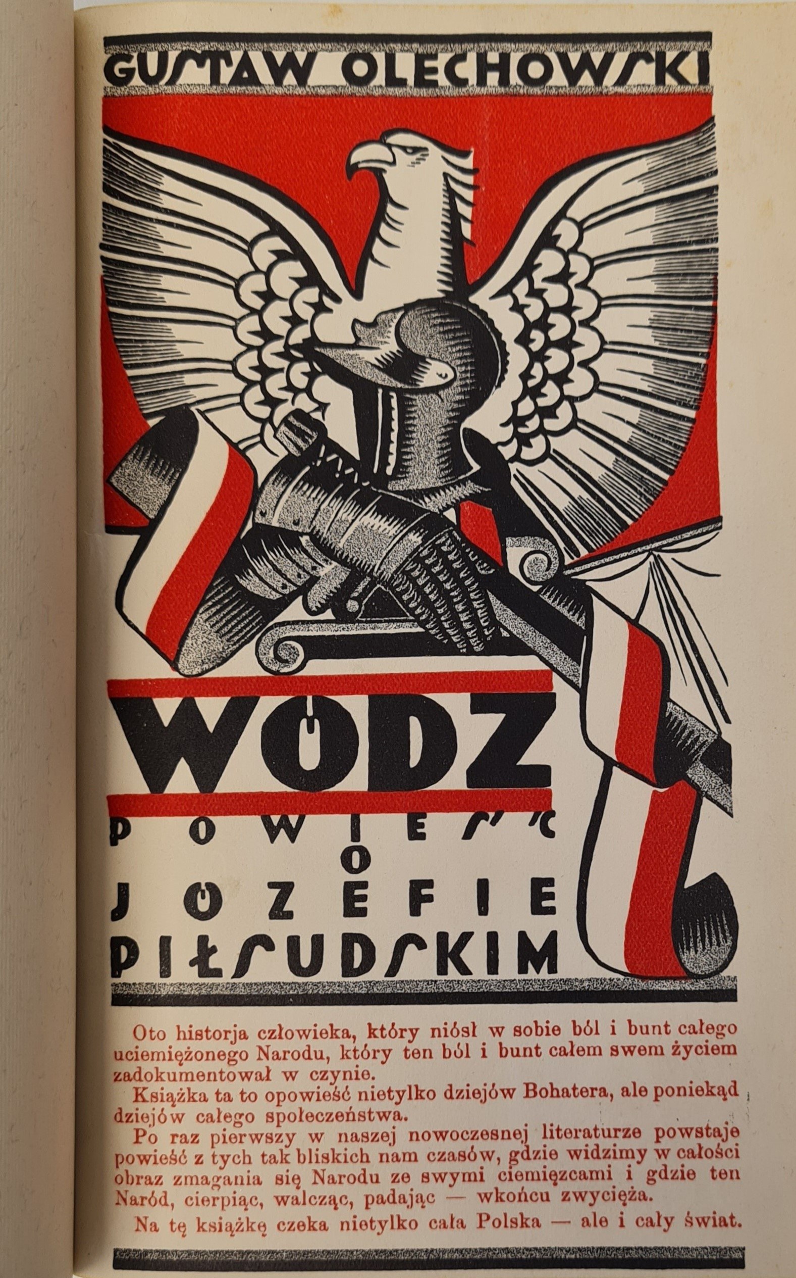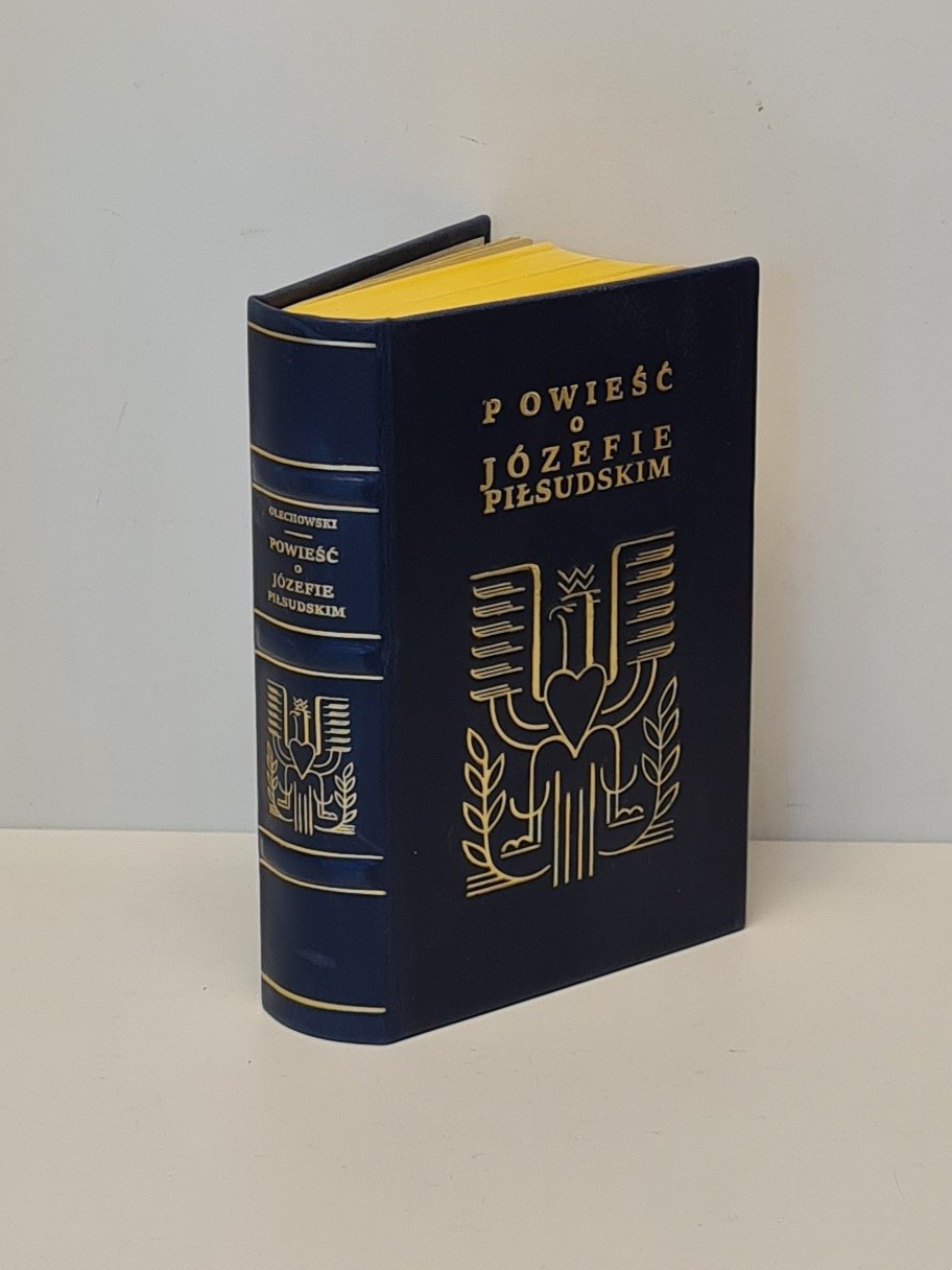 Olechowski Gustaw - Wódz. Powieść o Józefie Piłsudskim. Warszawa 1929 Instytut Wydawniczy Renaissance.Wym 13cm x 19,5 cm s. 424 Oprawa introligatorska współczesna, blok barwiony, w środku zachowana kartonowa oprawa wydawnicza z niewielkim zaplamieniem z tyłu.Książka kompletna w bardzo dobrym stanie zachowania.