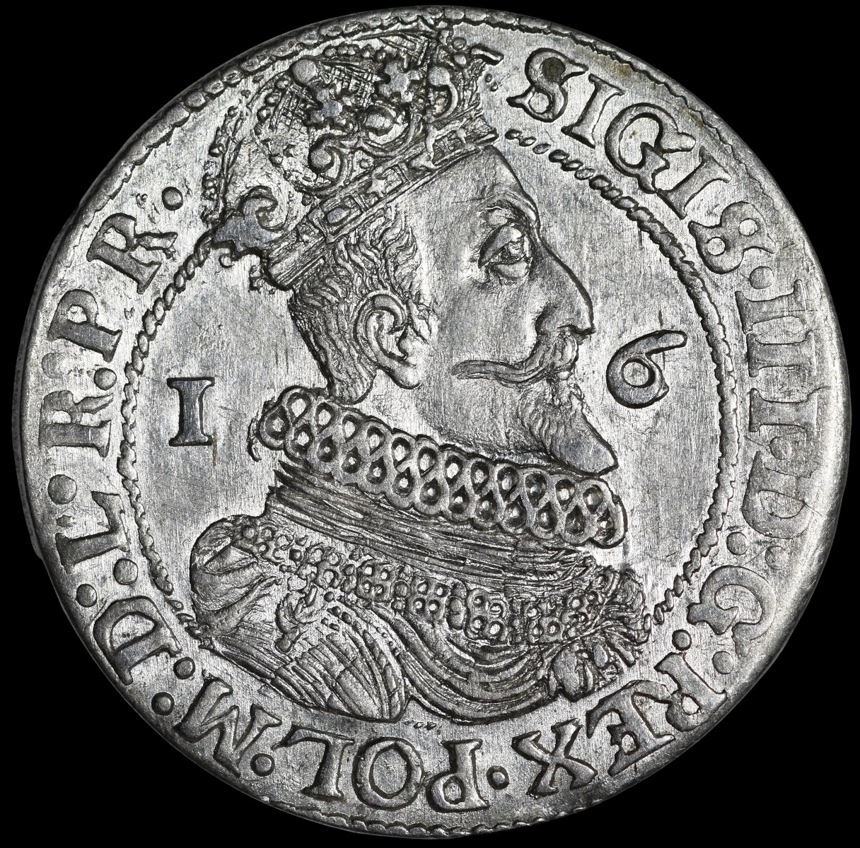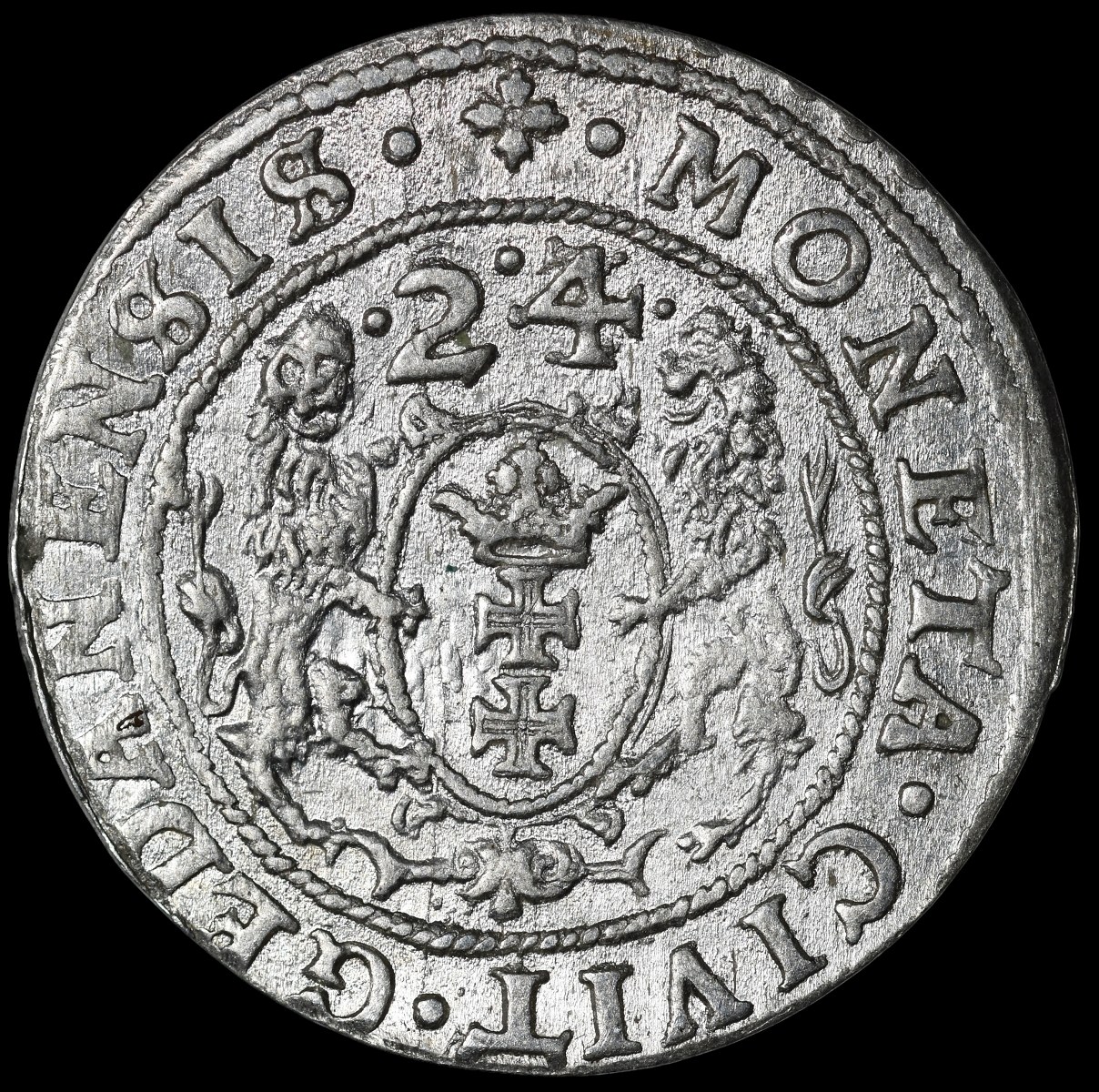Renesansowa tarcza z herbem Gdańska podtrzymywana przez dwa lwy na rewersie.