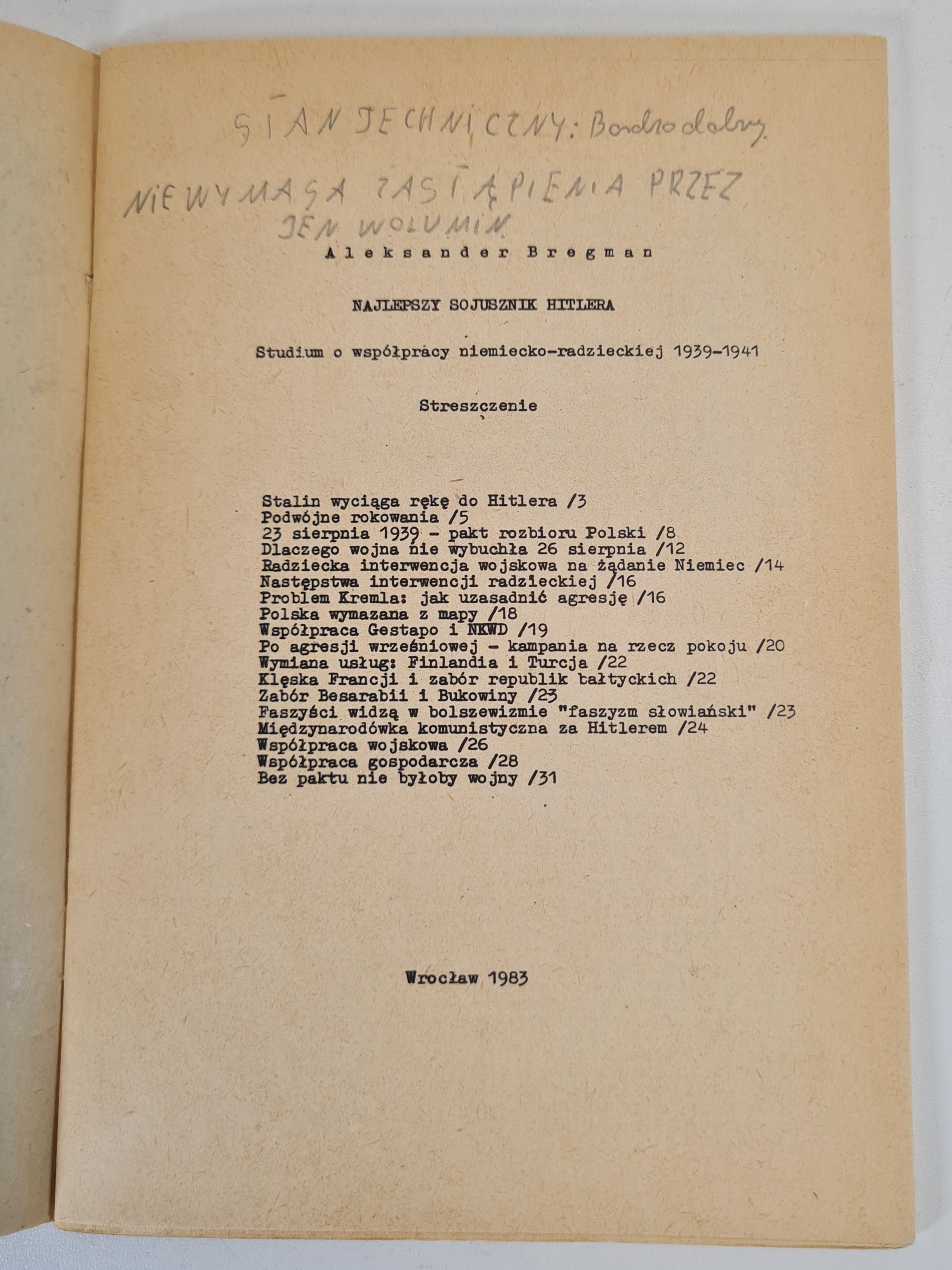 BREGMAN Aleksander - NAJLEPSZY SOJUSZNIK HITLERA. Studium o współpracy niemiecko-radzieckiej 1939-1941 Streszczenie (W czterdziestą czwartą rocznicę września)..