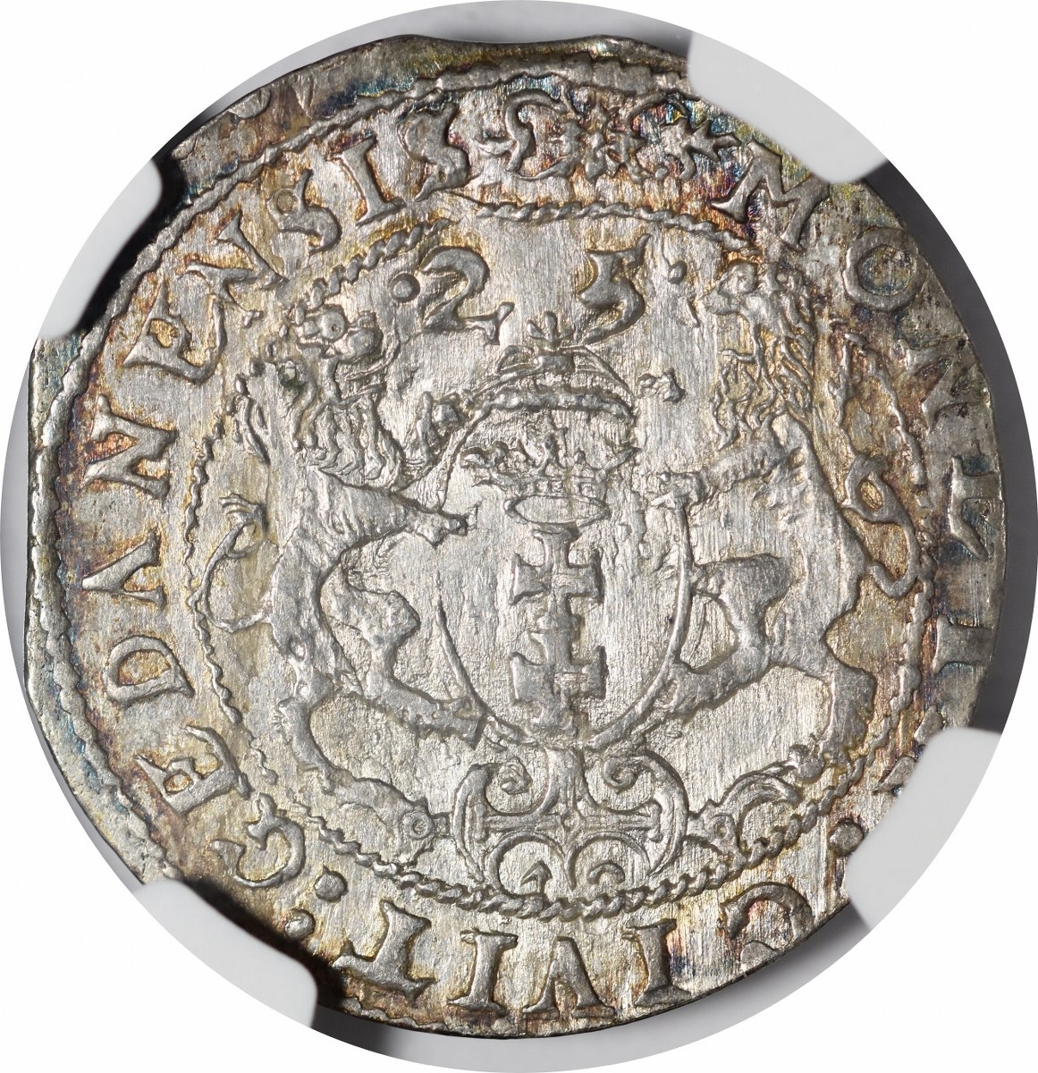 Renesansowa tarcza z herbem Gdańska podtrzymywana przez dwa lwy na rewersie.