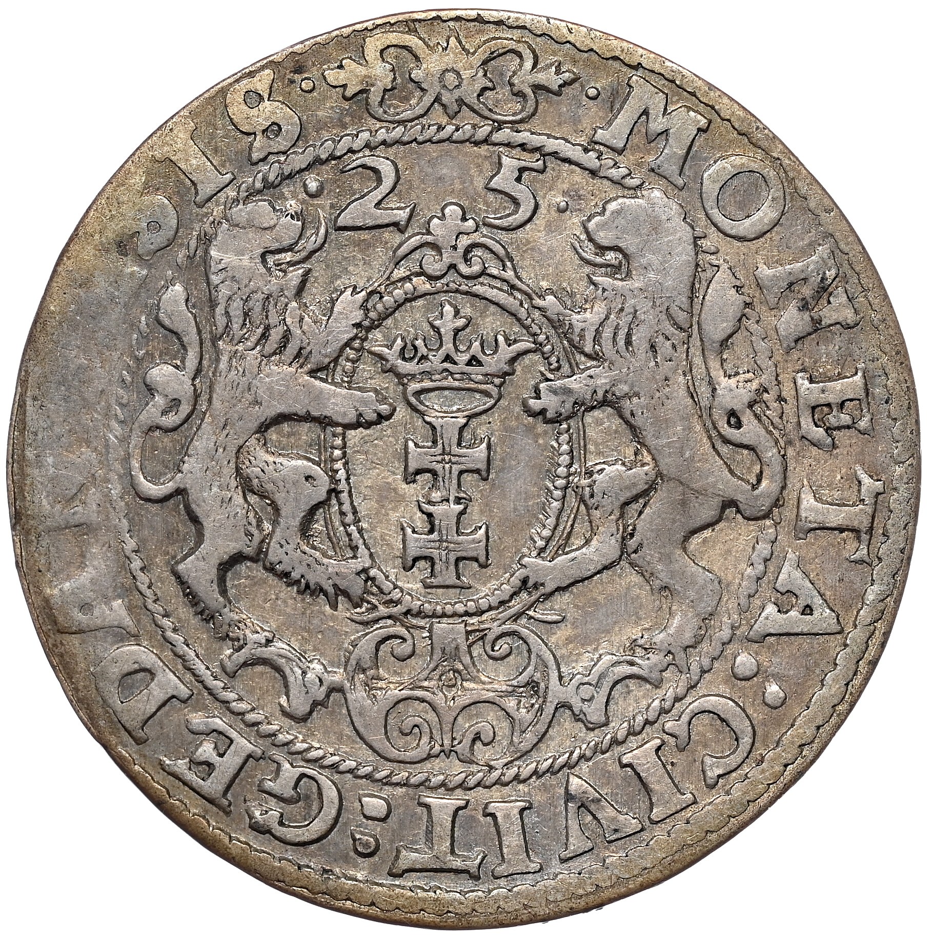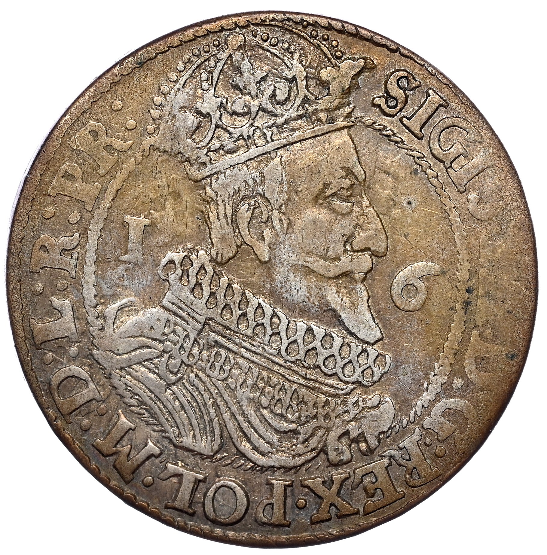 Równomiernie spatynowany, obiegowy ort. Końcówka legendy na awersie R:PR, kropki po bokach daty.