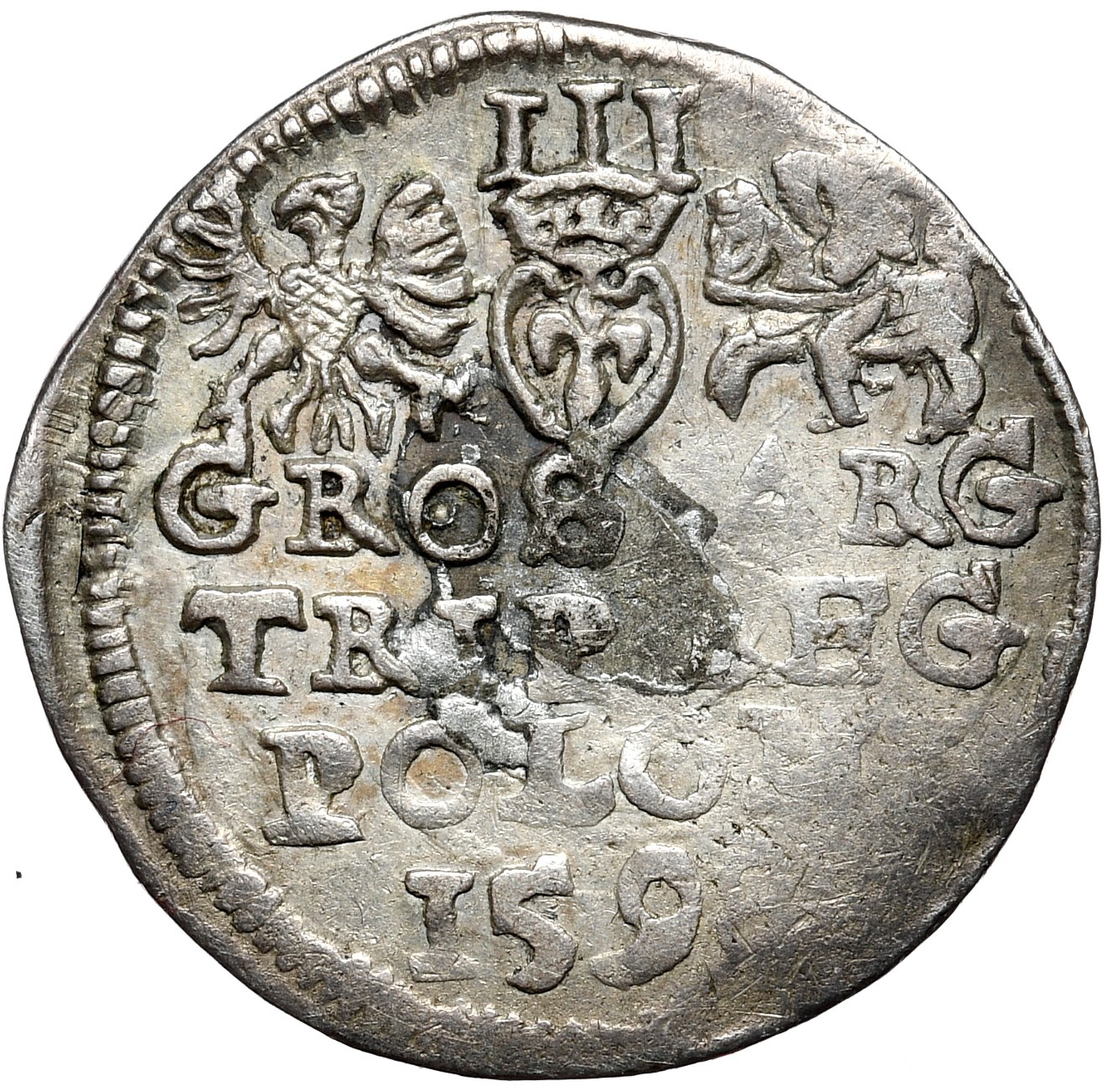Rzadszy trojak lubelski. W dodatku patrząc na katalog Igera - hybrydowy awers. Dobra czytelność szczegółów, obustronna patyna.