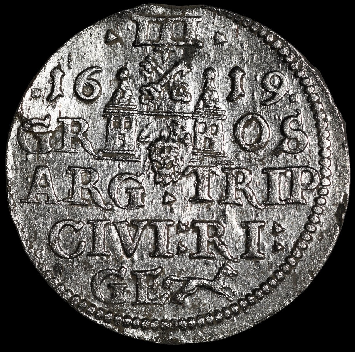 odmiana z większym portretem i szeroką rurkowatą kryzą. Rzadki rocznik. Atrakcyjna moneta.