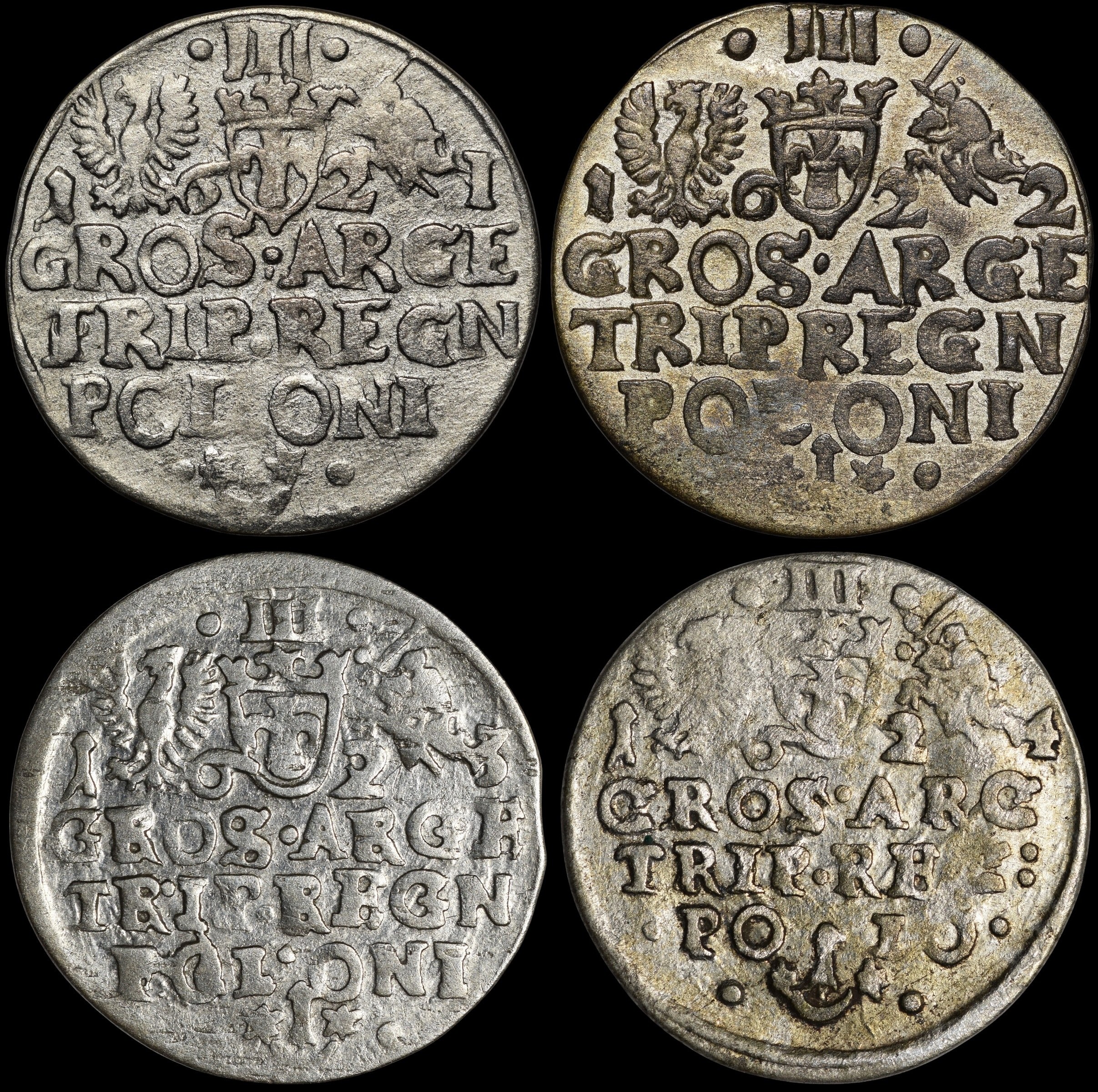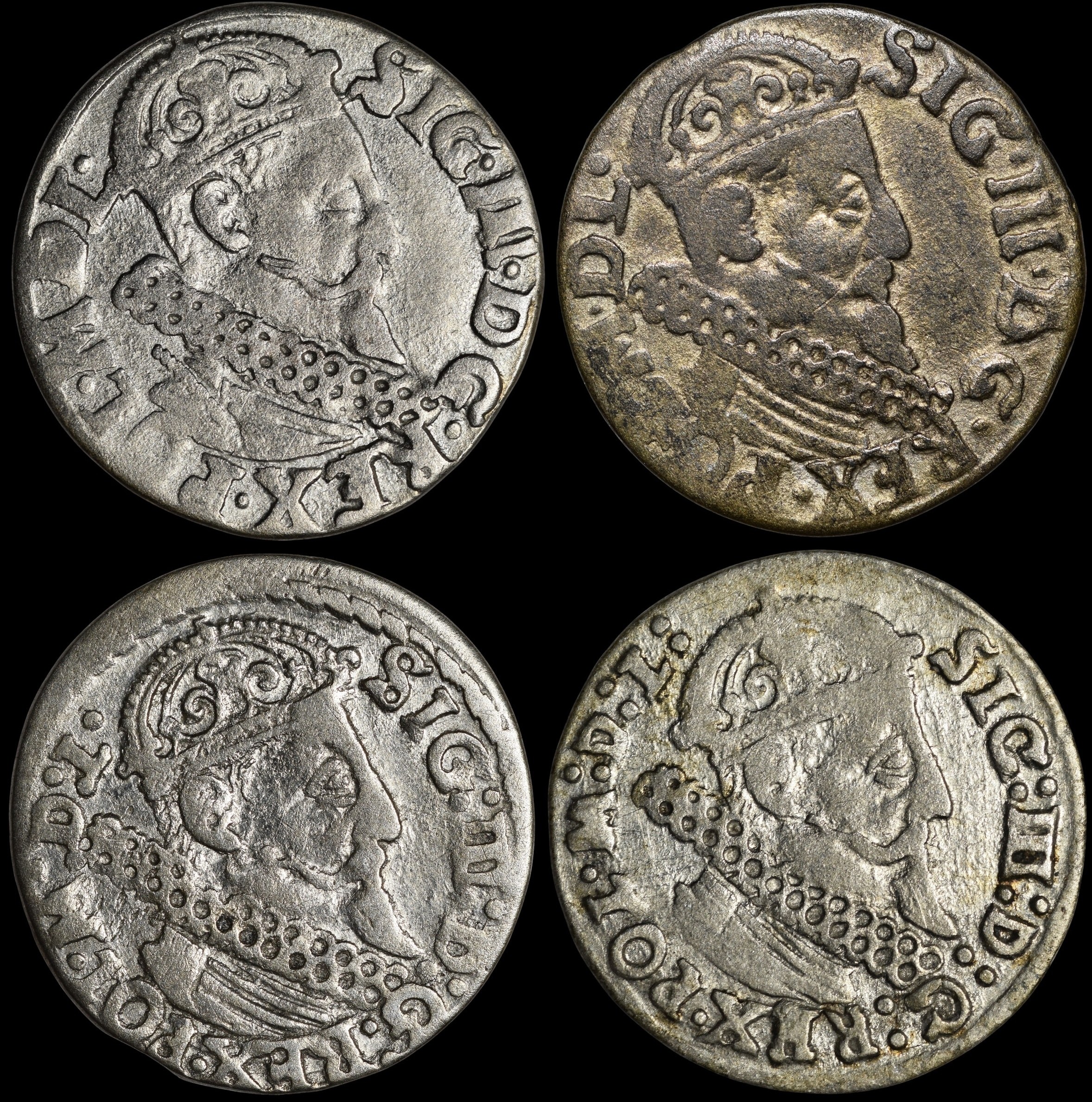 Zestaw czterech trojaków Zygmunta III Wazy wybitych w mennicy krakowskiej w