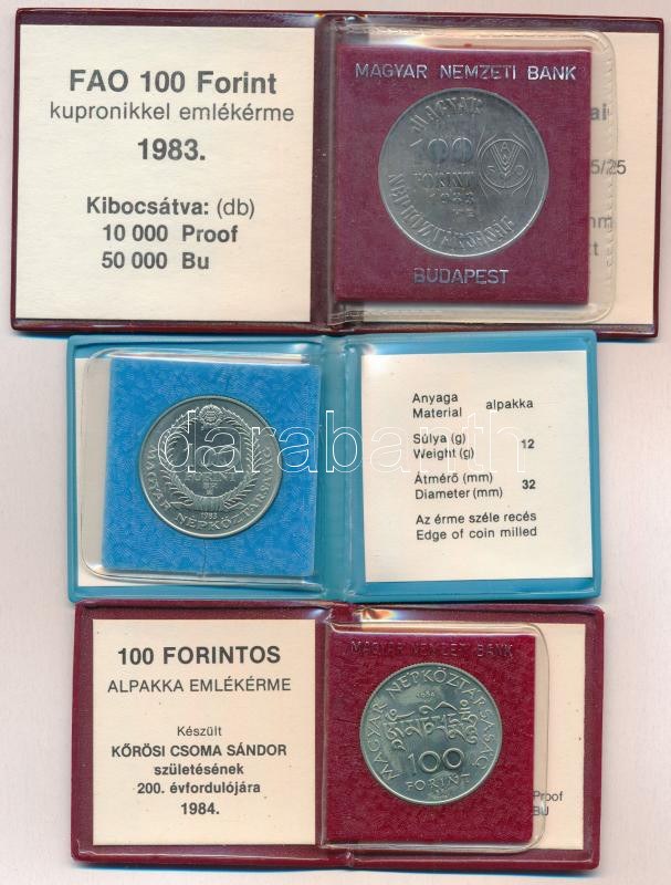 1983. 100Ft Cu-Ni "FAO - Több gabonát a világnak" eredeti műbőr tokban, tanúsítvánnyal + 1983. 100Ft Cu-Ni-Zn "Czóbel Béla" eredeti műbőr tokban, tanúsítvánnyal + 1984. 100Ft alpakka "Kőrösi Csoma Sándor" eredeti műbőr tokban, tanúsítvánnyal T:UNC Adamo EM72, EM75, EM78