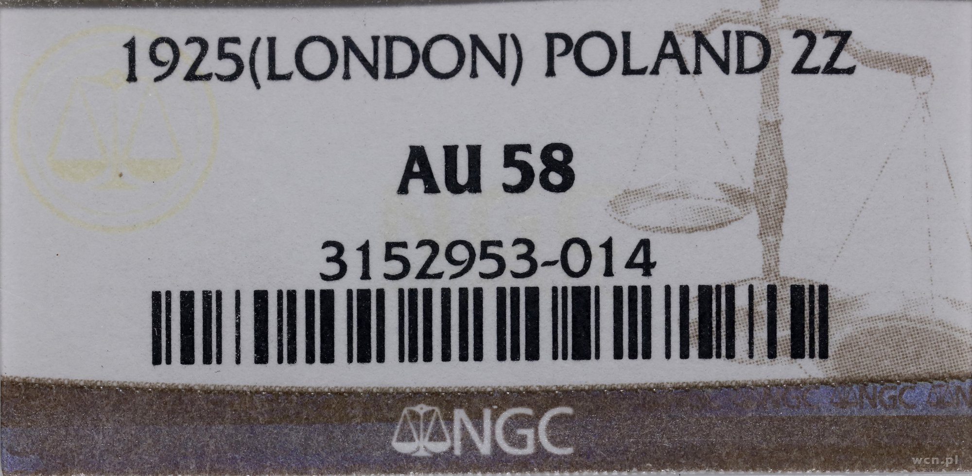 monety obiegowe, 2 złote, 1925, Londyn; Popiersie kobiety z kłosami, odmiana z kropką po dacie; Kop. 2902 (R), Parchimowicz 109d; bardzo ładnie zachowane z dużym blaskiem menniczym, moneta w pudełku NGC nr 3152953-014 z oceną AU58.