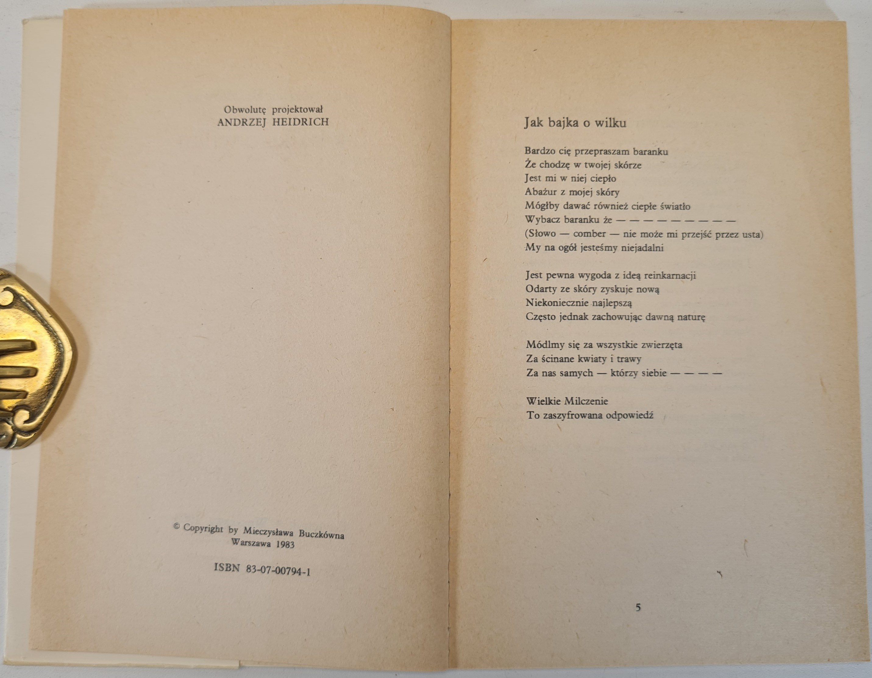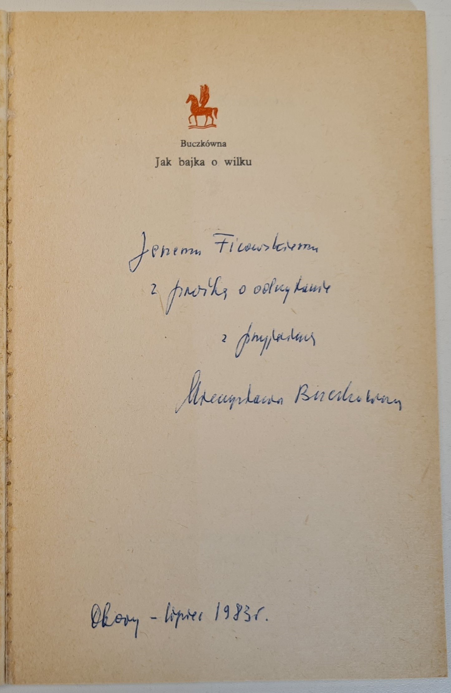 Dedykacja od Autorki dla Jerzego Ficowskiego. Wyd. CZYTELNIK, Warszawa 1983. Wydanie 1. Wym.19,5x12,5cm; stron 86. Broszura w obwolucie. Stan dobry(ślady użytkowania).
