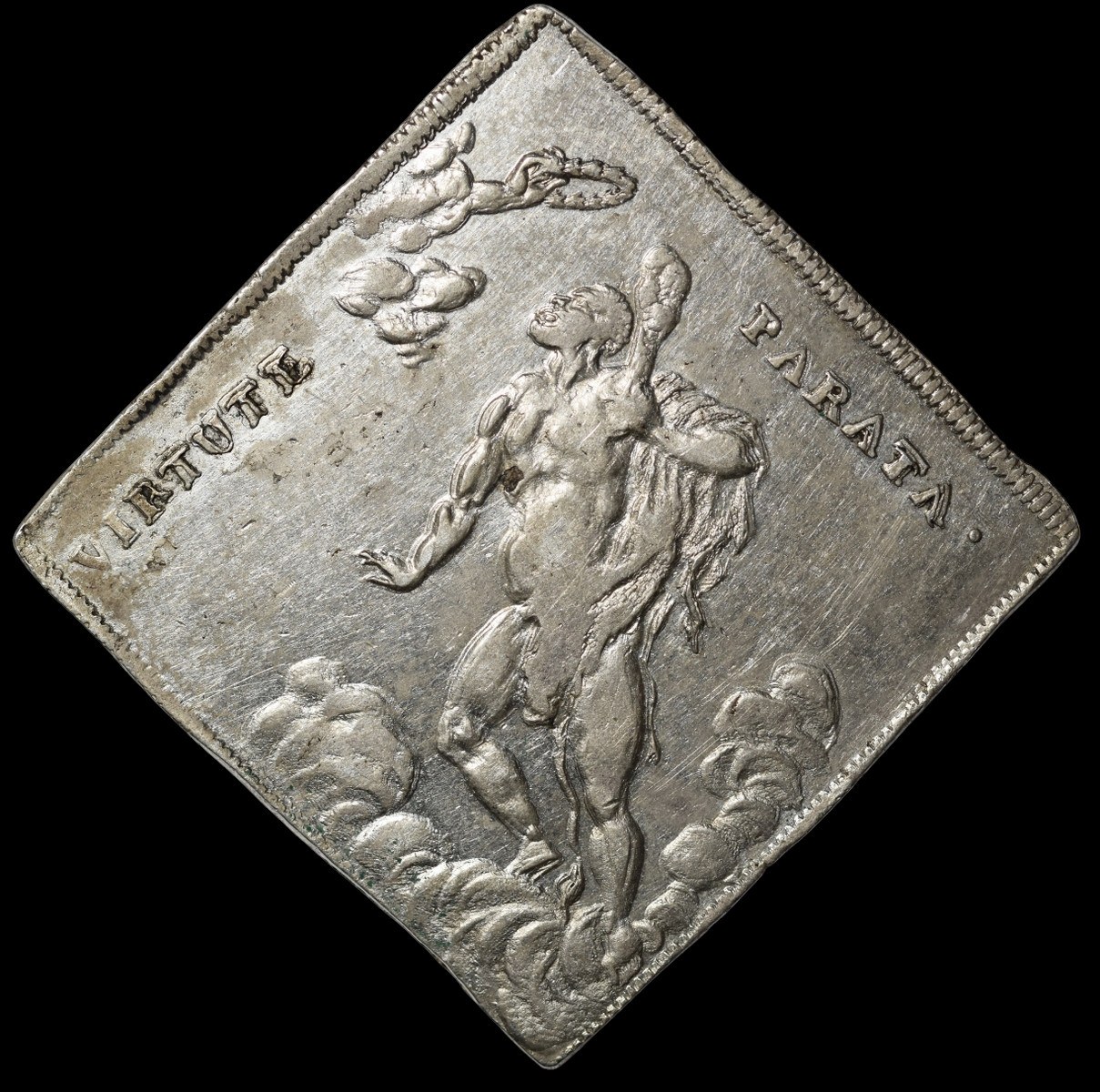 Herkules stojący w chmurach, nad nim wychylająca się z niebios ręka trzymająca