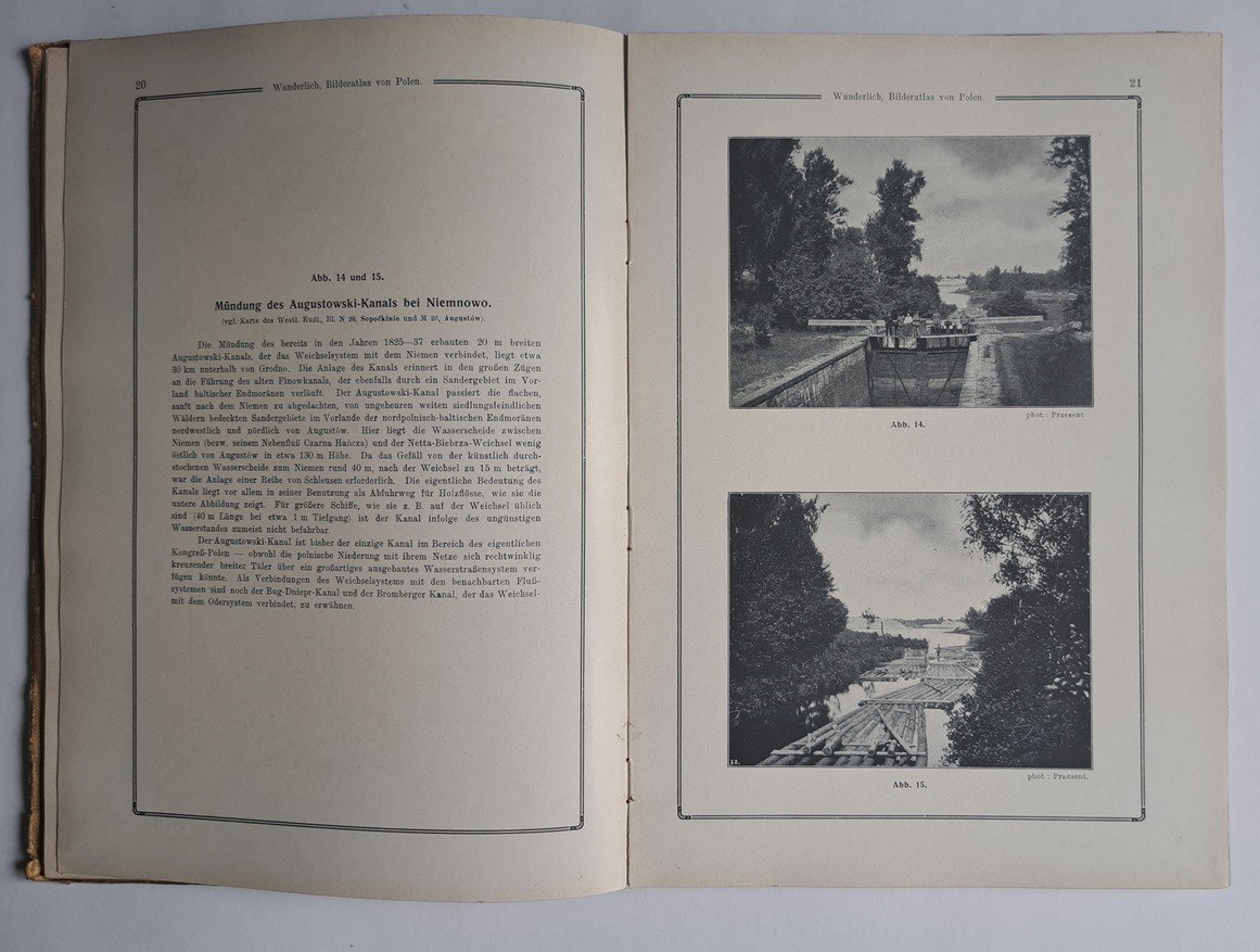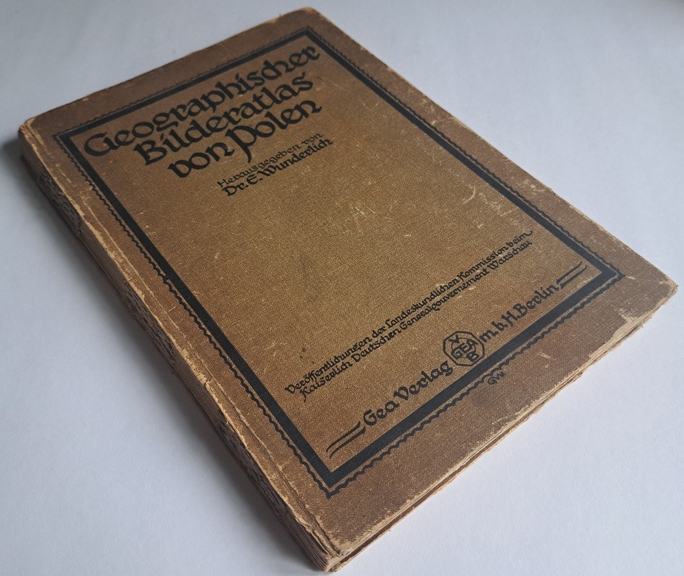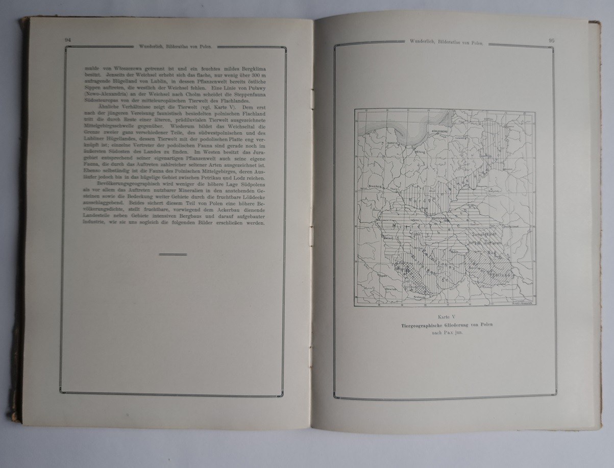 Atlas geograficzny Polski ze 100 oryginalnymi fotografiami oraz 6 mapkami ukazującymi między innymi mapę opadów oraz mapę ukształtowania terenu. Dodatkowo rozkładany arkusz przedstawiający "zachodnią Rosję" w skali 1:100000. Opisy poszczególnych regionów w języku niemieckim
