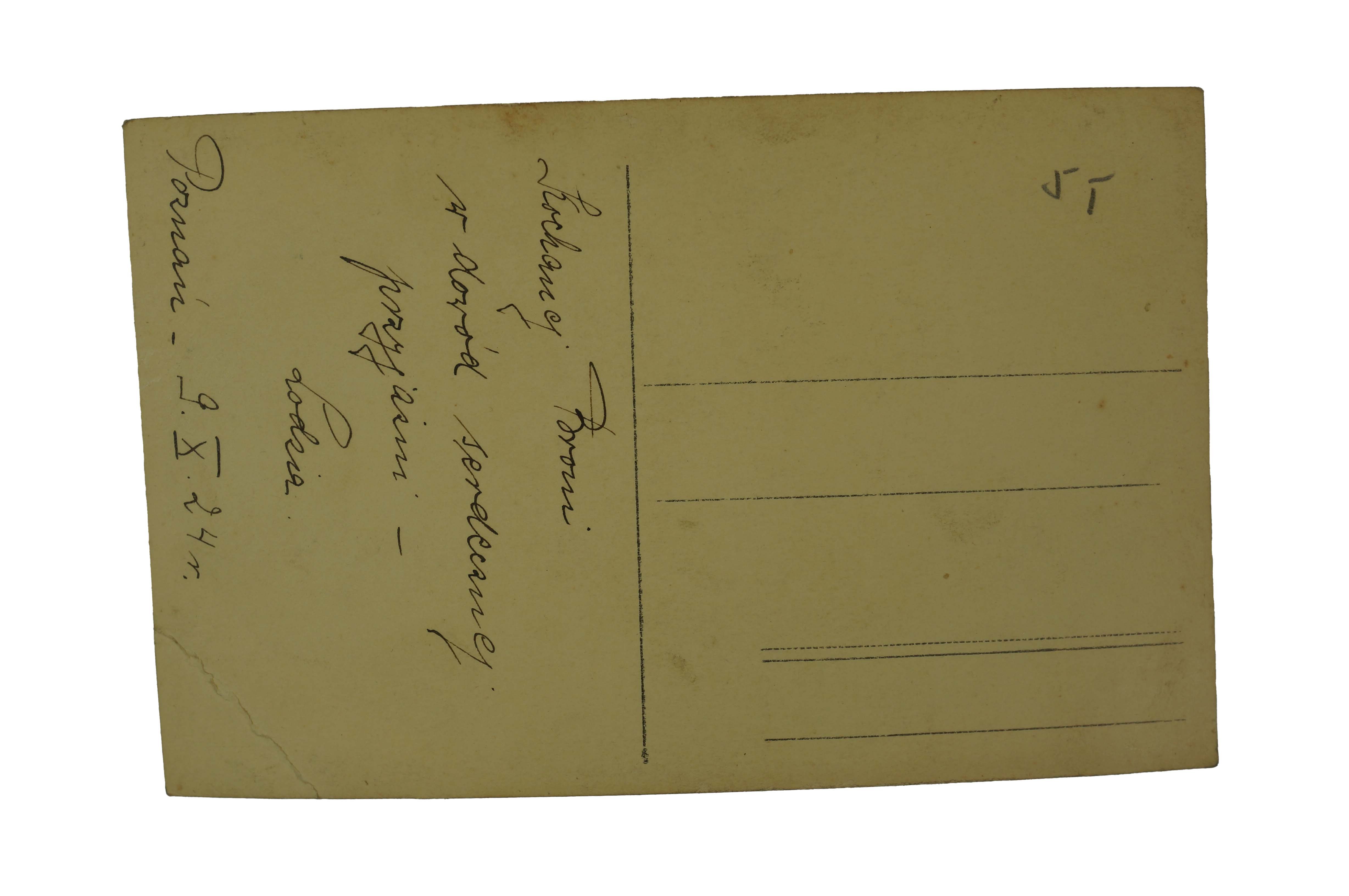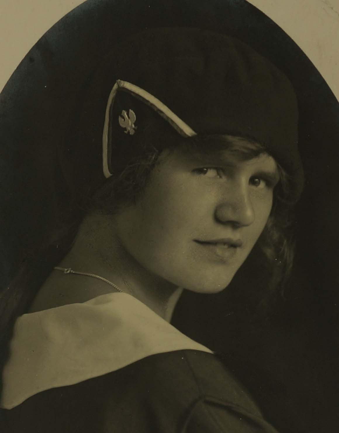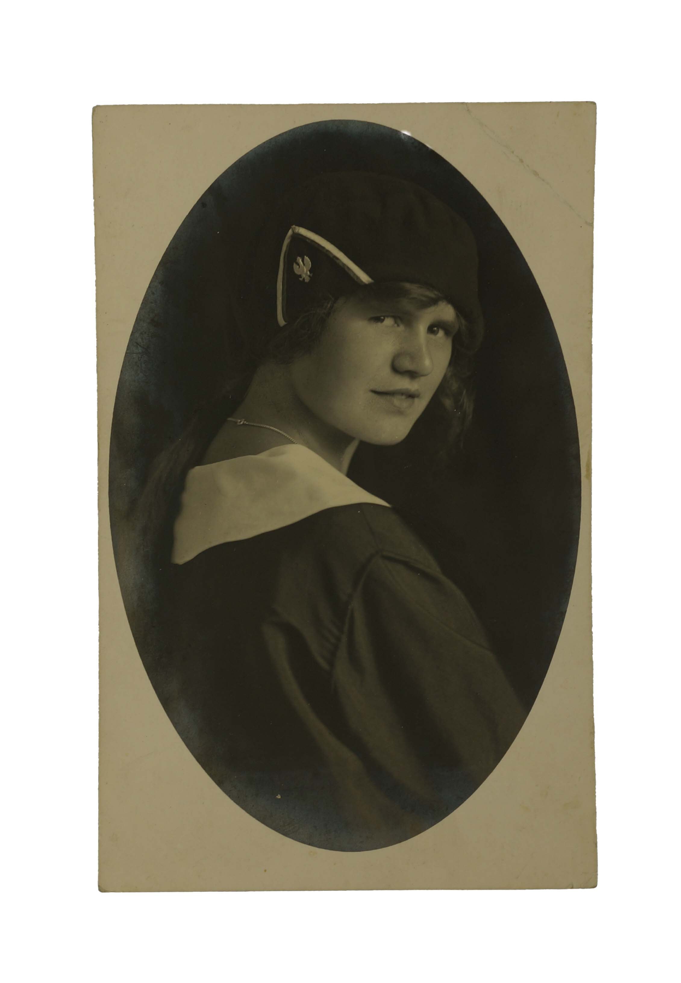 Dziewczyna w mundurku szkolnym , nakrycie głowy z orłem, 9.X.1924r., f. 8,6x13,5cm