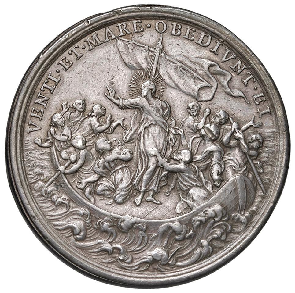 Clemente XI (1700-1721) Medaglia coniata annuale 1718 A. XIX Le missioni in Asia, Gesù tra gli apostoli su una nave in balia del mare in tempesta - Opus: E. Hamerani - Bartolotti E719; Miselli 117 - AG (g 27,62 - Ø 38,5 mm) RR Appiccagnolo rimosso e colpi al bordo