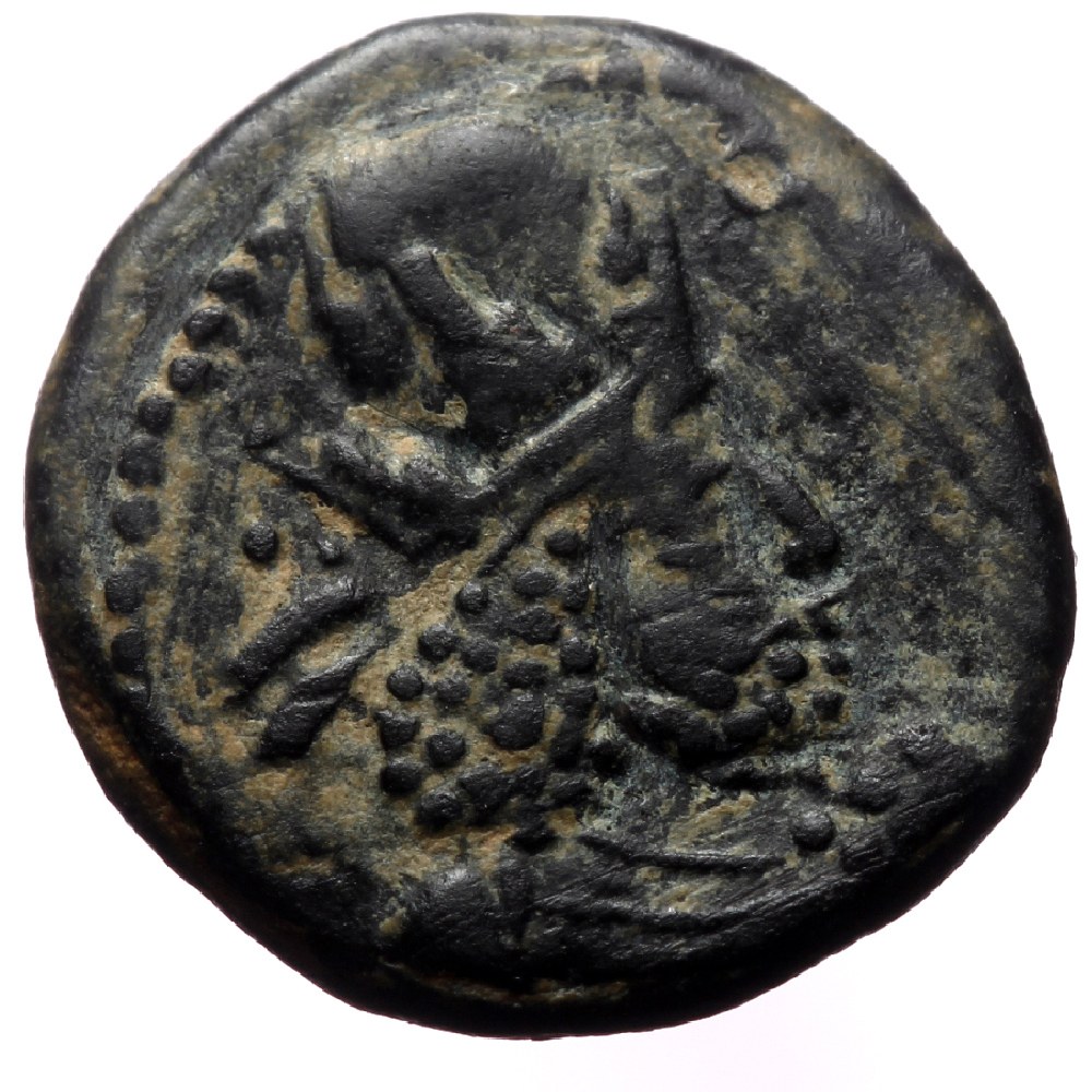 Obv: Decorated facing bust of king right, wearing earrings and mural crown surmounted by globe or korymbos.