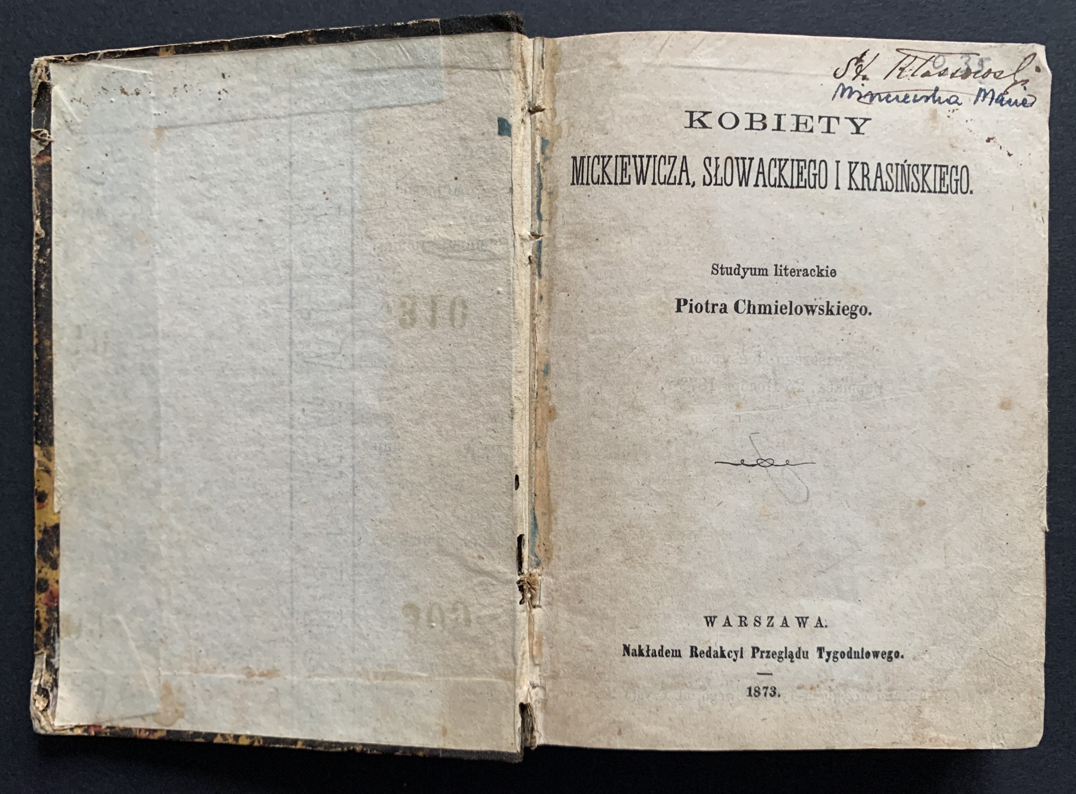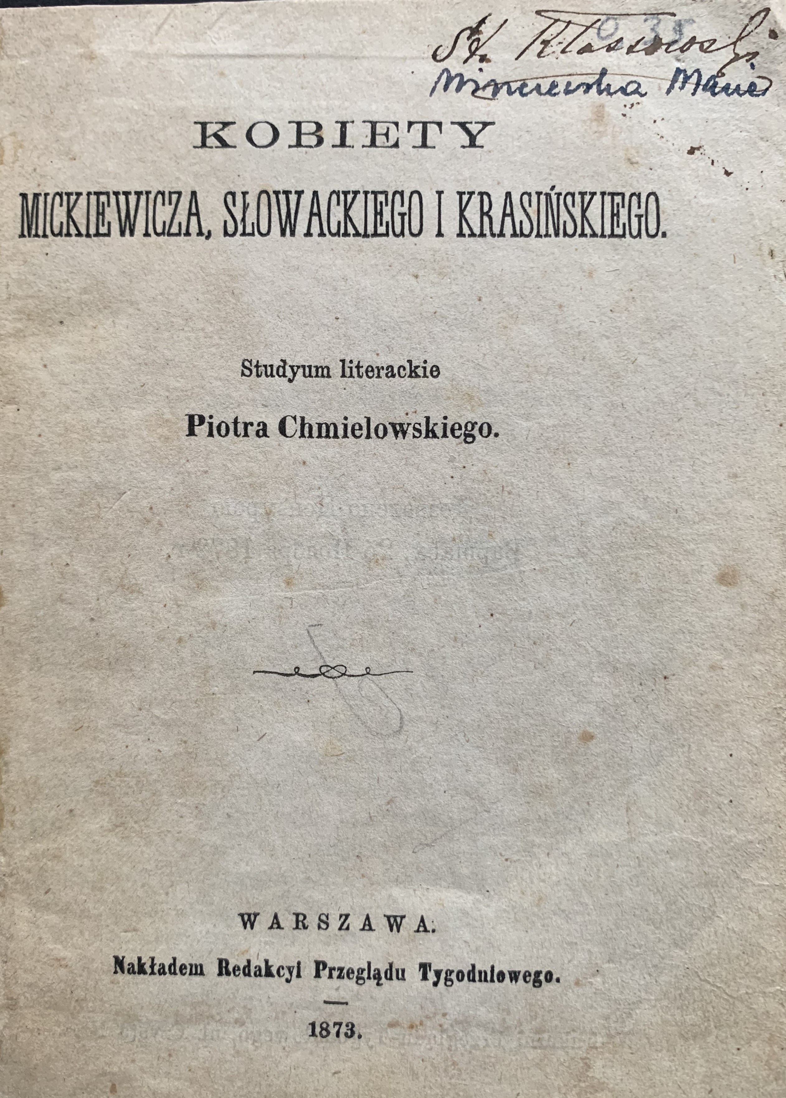 Kobiety Mickiewicza, Słowackiego i Krasińskiego: studyum literackie Piotra Chmielowskiego. Warszawa 1873. Nakładem Red. Przeglądu Tygodniowego.