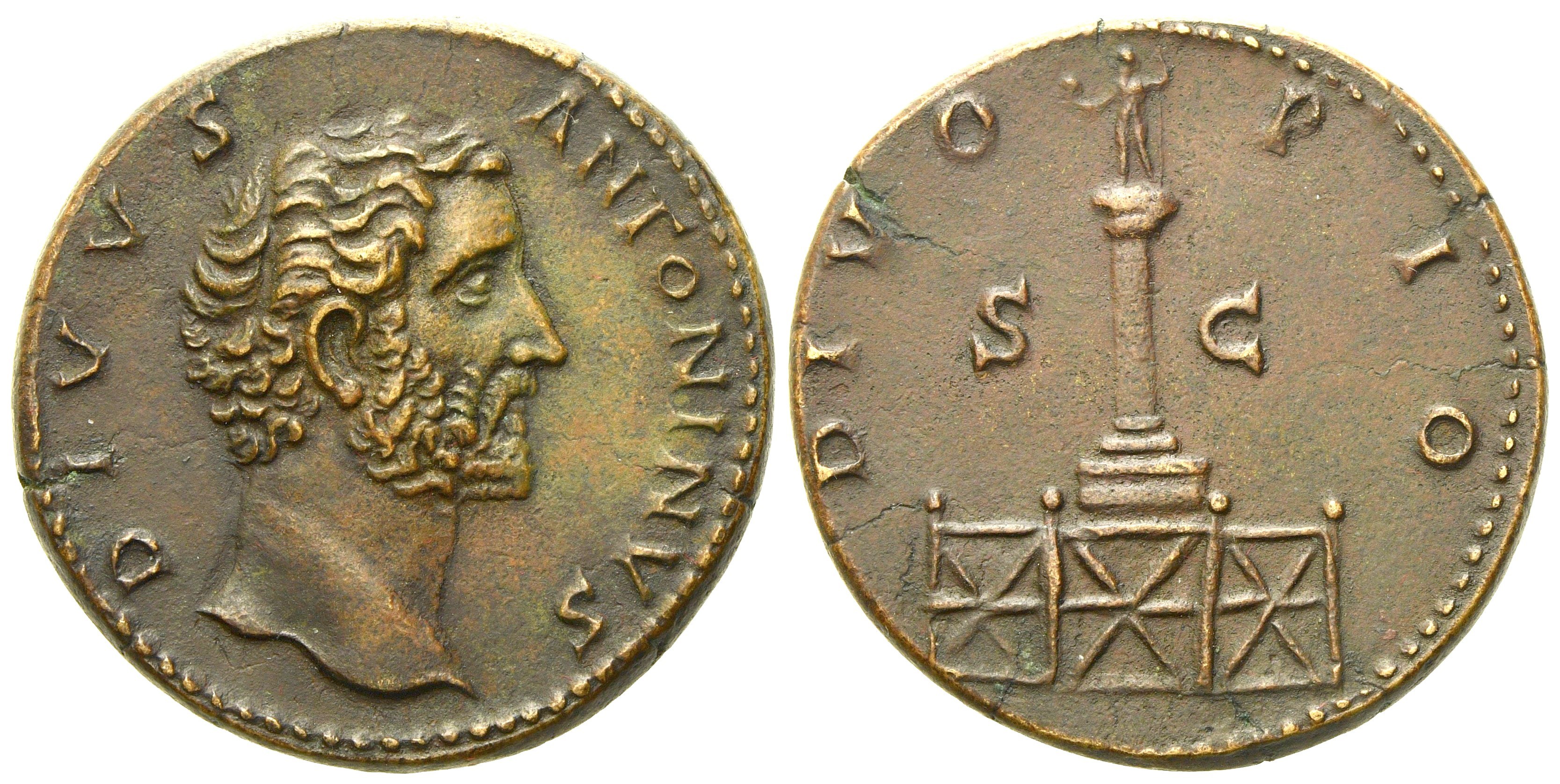 Divus Antoninus Pius, Sestertius struck under Marcus Aurelius, Rome, after AD 161; Æ (g 22,84; mm 32); DIVVS - ANTONINVS, bare head r., Rv. DIVO - PIO, column set on base within fence and surmounted by statue of Divus Antoninus, standing front, holding eagle and long sceptre; in field, S - C. RIC 1269; C 354. Riverine tone; good extremely fine.