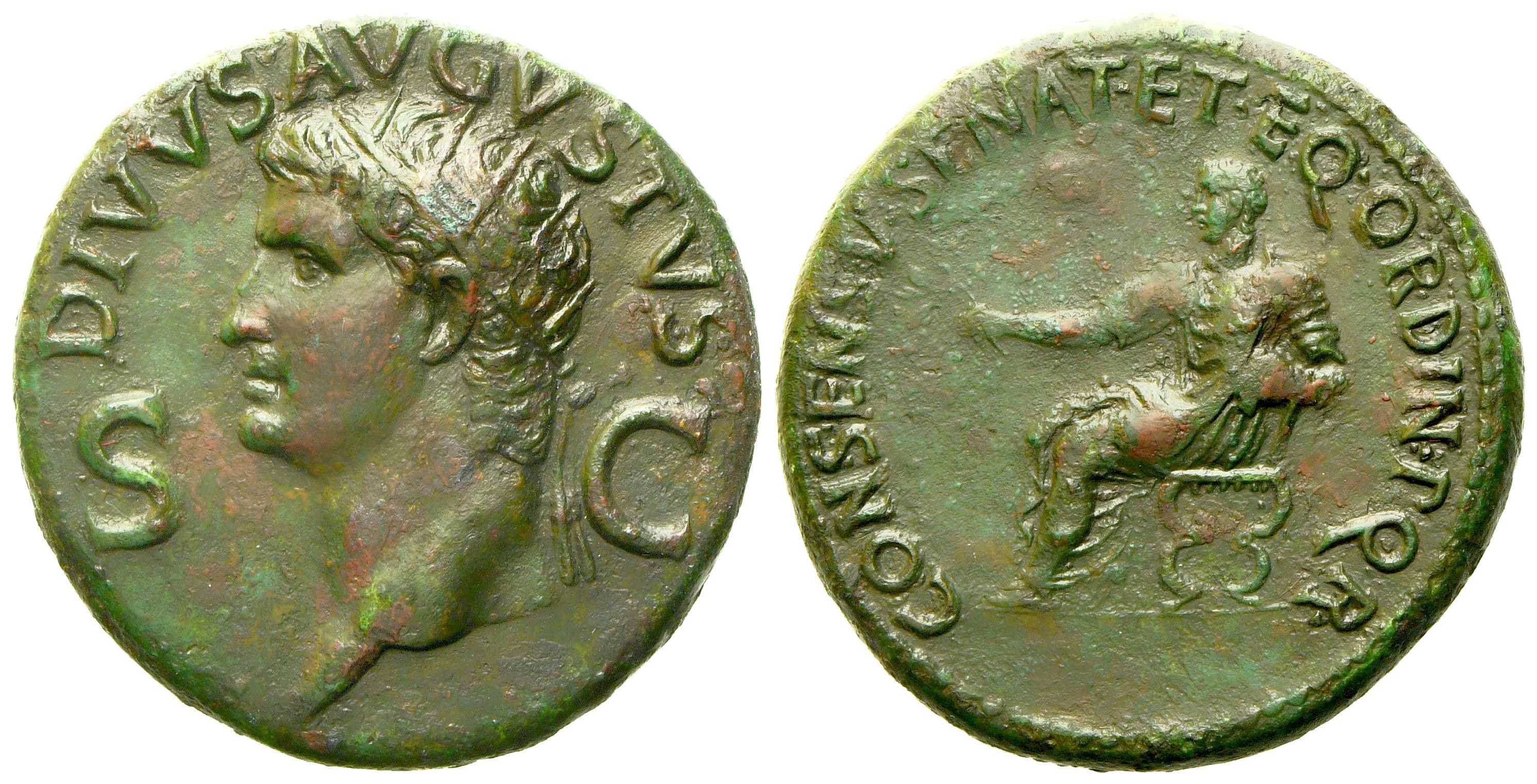 Divus Augustus, Dupondius struck under Gaius (Caligula), Rome, AD 37-41; Æ (g 15,30; mm 28); DIVVS AVGVSTVS, radiate head l.; in field, S - C, Rv. CONSENSV SENAT ET EQ ORDIN P Q R, Gaius (or Augustus) seated l. on curule chair, holding branch and globe. RIC 56; C 87. Glossy, green patina with reddish hues; untouched surfaces; good extremely fine.