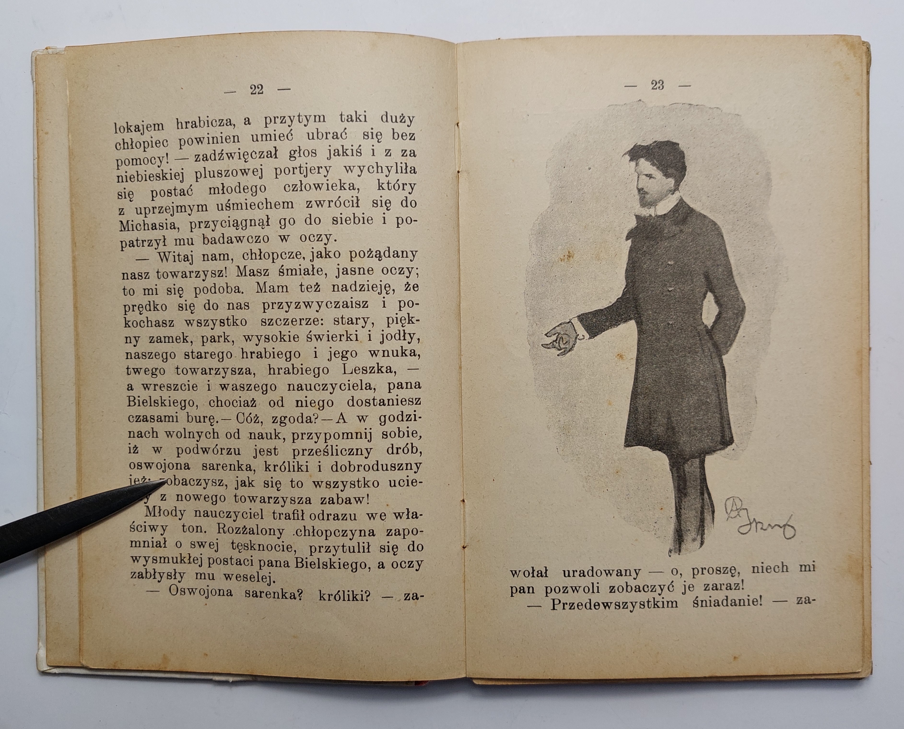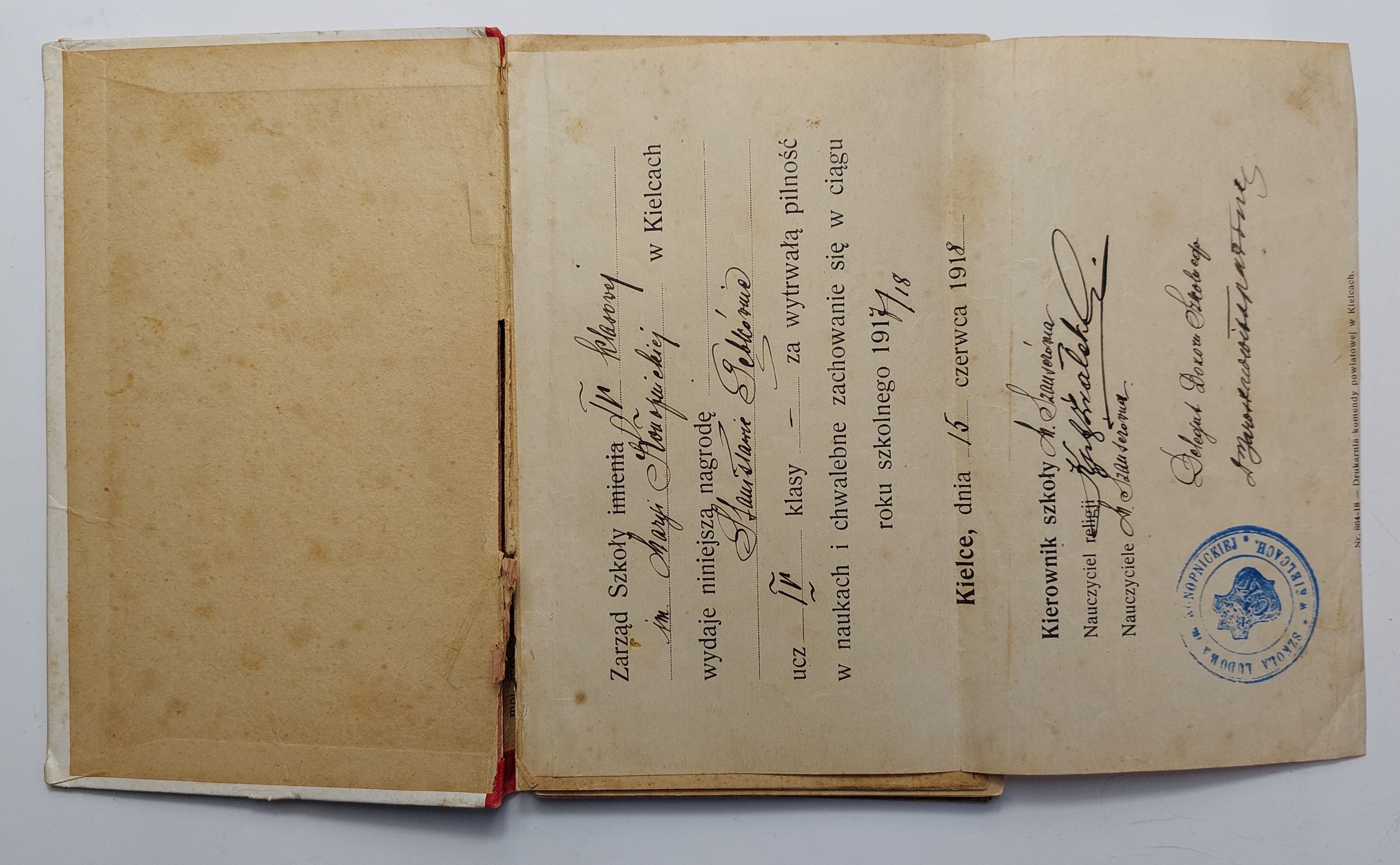 Oprawa wydawnicza, półpłótno. Blok pęknięty, ostatnia sklejka luzem. Na przedniej wyklejce, wklejony arkusz z podpisami nauczycieli i kierownictwa Szkoły im. M. Konopnickiej w Kielcach z dnia 15 czerwca 1918 r. przyznający książkę jako nagrodę dla uczennicy tejże szkoły.