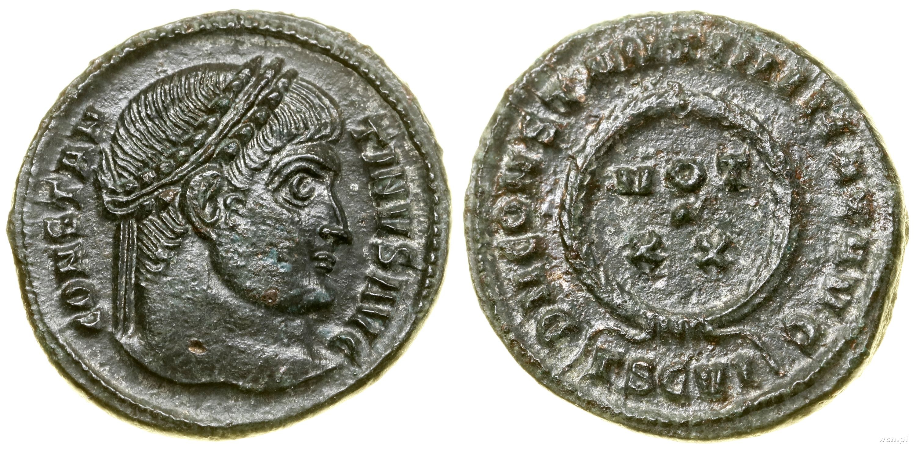 Aw: Głowa cesarza w prawo, CONSTANTINVS AVG; Rw: W wieńcu laurowym VOT XX, D N CONSTANTINI MAX AVG, u dołu TSEVI